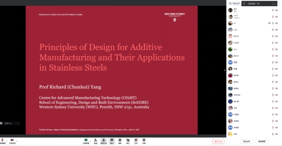 4月19日下午,澳大利亚西悉尼大学杨春晖教授应邀为我院师生作题为《3D金属打印与增材制造》的线上学术讲座。会议由122cc太阳集成游戏院长杜力主持,副院长李平及60余名研究生参加。