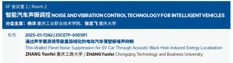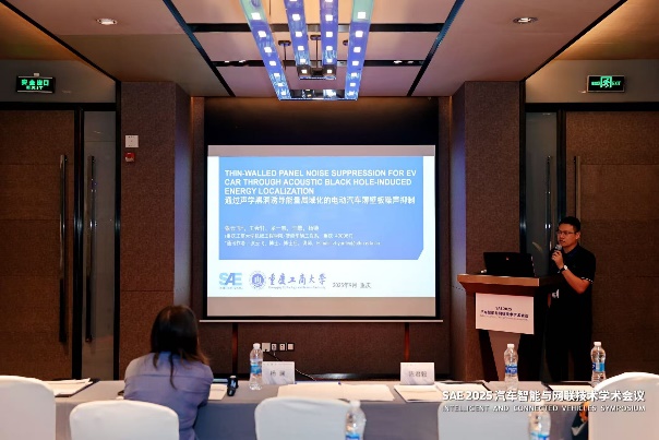 张云飞博士在“智能汽车声振调控”论坛上作了主题为“Thin-Walled Panel Noise Suppression for EV Car Through Acoustic Black Hole-Induced Energy Localization(通过声学黑洞诱导能量局域化的电动汽车薄壁板噪声抑制)”的报告。报告聚焦电动汽车噪声控制核心技术,展现了122cc太阳集成游戏在智能车辆工程领域的研究实力与创新成果,赢得了参会者的广泛关注。借此大会搭建的高端交流平台,张云飞博士同步向现场专家学者介绍了重庆工商大学智能车辆工程专业的历史沿革、学科定位、团队情况与特色优势,进一步扩大了专业的行业影响力。此外,张博士还与参会嘉宾就报告中的技术细节、应用场景及未来研究方向展开深入探讨,为后续学术合作埋下伏笔。