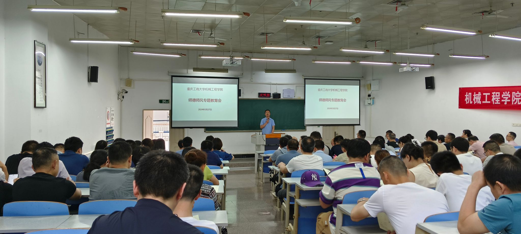 为进一步落实《中共教育部党组关于完善高校教师思想政治和师德师风建设工作体制机制的指导意见》(教党〔2021〕79号)、《中共教育部党组关于印发<普通高等学校教师党建和思想政治工作质量标准(试行)>的通知》(教党〔2023〕66号)、《教育部办公厅关于进一步压实高校师德师风建设主体责任的通知》(教师厅函〔2024〕2号)等文件精神,对标对表《重庆工商大学贯彻落实<普通高等学校教师党建和思想政治工作质量标准(试行)>任务分解》,强化日常教育引导,发挥师德失范问题典型案例警示作用,引导广大教职工知准则、守底线,自觉涵养高尚师德,建设政治素质过硬、业务能力精湛、育人水平高超的高素质教师队伍,5月27日,122cc太阳集成游戏在慧智楼90309教室召开师德师风教育专题教职工大会。会议由学院党委副书记、纪委书记陈春洁主持,学院全体教职工参加。