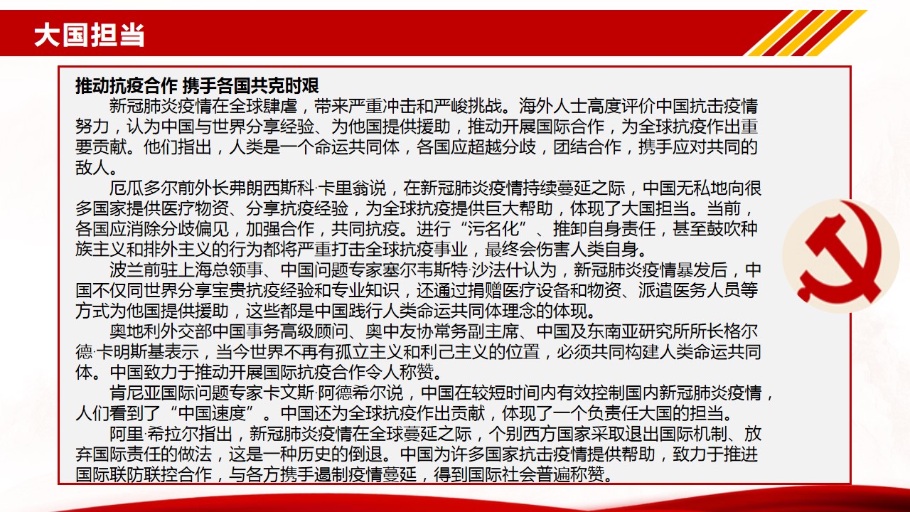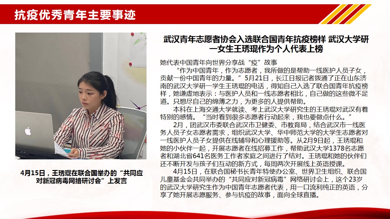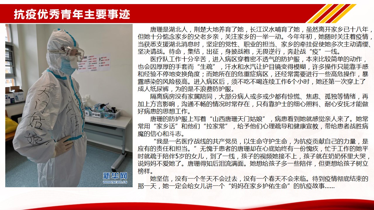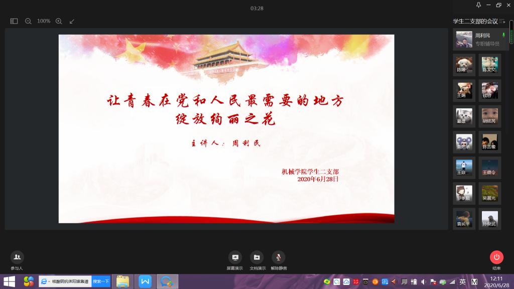 根据122cc太阳集成游戏开展基层党组织常态化疫情防控“四个一”行动和“党课开讲啦”的通知,结合122cc太阳集成游戏党总支的部署和要求,122cc太阳集成游戏学生二支部于6月28日通过企业微信在线方式开展了主题党课“让青春在党和人民最需要的地方绽放绚丽之花”。本次党课由支部书记周利民老师主讲,党课以疫情期间冲锋在前的几个典型的优秀青年鲜活的事例为序,带领支部党员再次把目光聚焦在疫情期间的志愿者身上,学习他们勇于担当、践行初心使命的精神。随后,结合《抗击新冠肺炎疫情的中国行动》白皮书,用一组组扎实的数据,带大家一起回顾了新冠肺炎疫情防控取得的显著成效。通过此次学习和总结,支部党员再次感受到了“中国力量”、“中国精神”、“中国社会主义制度的优越性”。抗击新冠肺炎疫情是一场大考,中国展现的出色的疫情防控能力,也为世界防疫树立了典范。