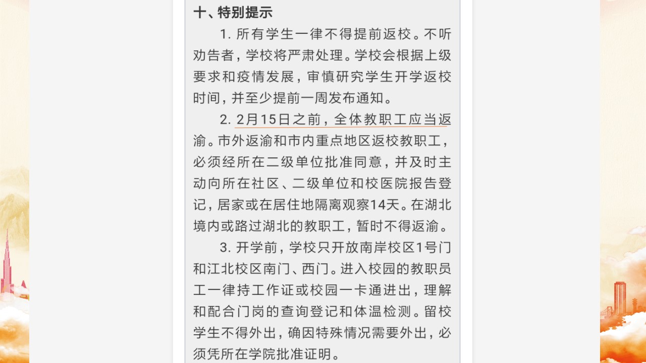 各位老师大家好,我是袁娅婷,一名普通的辅导员,很荣幸在这里给大家分享我的战役故事。今年年初突发的新冠疫情,对于每一个人来说,都是挑战。疫情初期,每天刷新的感染人数、未知的病毒及感染途径,使得产后几个月的我陷入的深深的焦虑。由于身在江西新余老家,1月底新余市医院发生20多名医护感染,使得城市气氛变得尤为紧张。小区封闭管理、高速路口禁止下道、城区交通灯红灯常亮,好像整个城市都按下了暂停。虽然身处新年假期,但家中每一个人的工作却丝毫都未停歇。
