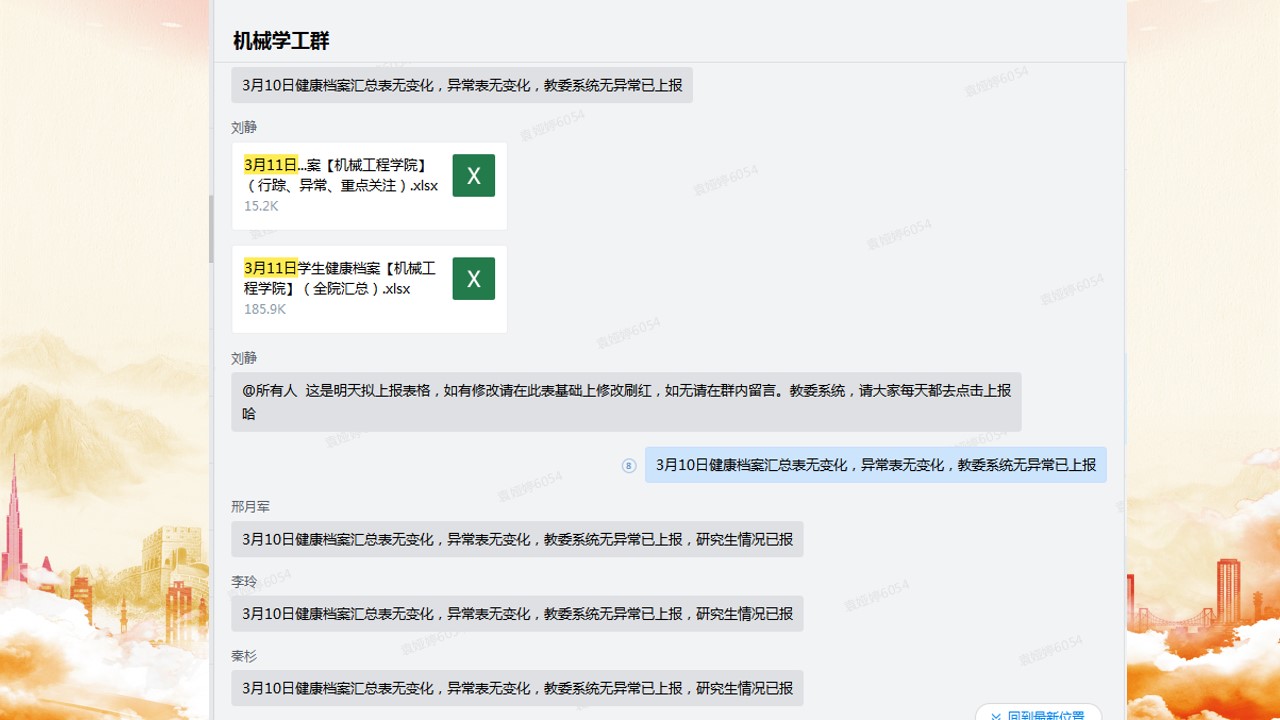 回到重庆后,虽然校历并未开学,但是工作的内容逐渐多了起来。统计与更新学生的居住地址、教委疫情系统的每日上报,答复学生各种关于开学的疑虑,以及部分问题学生由于居家时间太久,亲子关系已经出现了严重的问题,需要辅导员进行心理疏导与转介心理咨询中心。就在各种琐碎的工作进行中,4月底市教委终于发布了返校通知。在传达学校分批返校政策的同时,作为辅导员,需要不停的给同学们宣传防疫知识,关注学生的返校路线,避开重点疫区,将学校的实时更新的各项政策以同学们能够接受的方式传达给学生。在4月27日,我迎来了首批湖北返校的学生。同学们都很配合的遵守学校关于湖北的健康管理政策,每日通过企业微信与我沟通自己的身体状况,我也通过聊天侧面每天了解同学们的心理状态,确保同学们的身心健康。我不禁感叹,在这场战役中,每一位公民都在尽自己的责任与力量配合防疫工作,帮助社会回归正常的秩序。