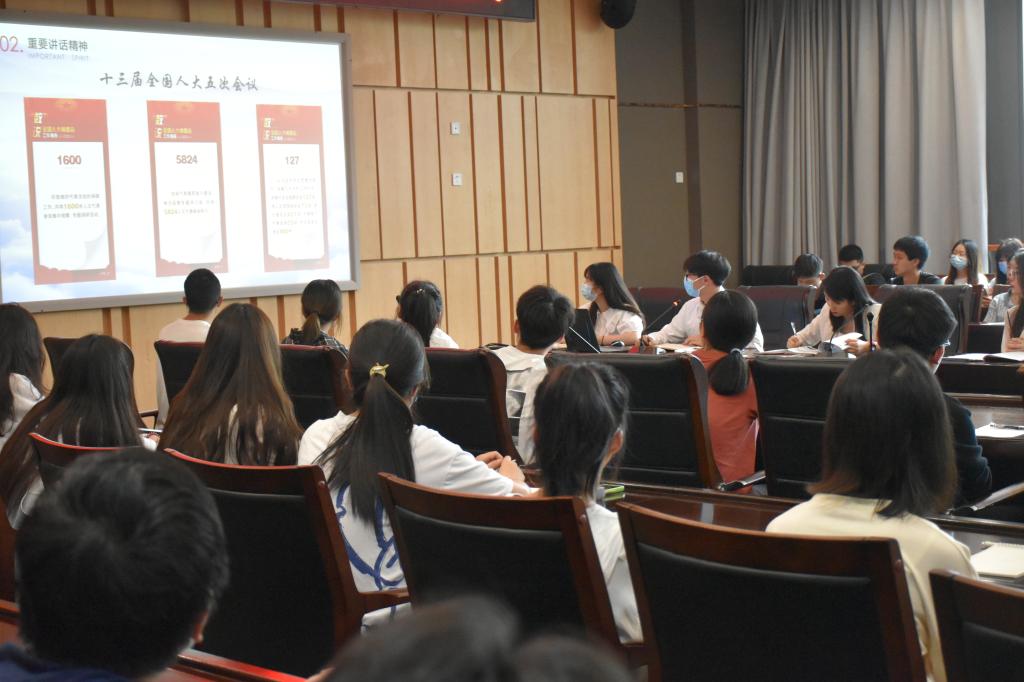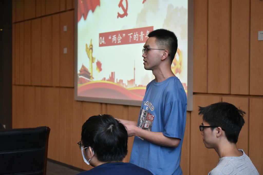 随后,学生党员曹鹏同学开启了“学生党员讲党课”的第一讲,曹鹏同学从“两会”基本知识、重要讲话精神等方面带领全体党员和入党积极分子开展学习宣讲。同学们还以“两会”背景下的青年为主题,畅谈了自己的学习体会。