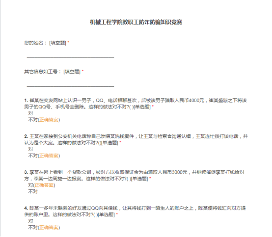 工会通过线上宣传的方式,向教职工普及和讲解常见诈骗案件的特点及犯罪分子的惯用手法、作案方式、识别信息和防范技巧,提高教职工的安全防范意识。同时提醒教职工不要轻信陌生人信息、电话,遇到问题可拨打110核实。知识竞赛内容涉及日常诈骗案件中的交友、贷款、网购等与教职工生活息息相关的主题,通过竞赛,让教职工了解电信诈骗、熟知电信诈骗的套路。对于得分较低的教职工,针对错题情况开展线下相关防骗知识普及,树立教职工的法律意识和法制观念,让教职工懂得如何运用正确的法律武器维护自身合法权益。