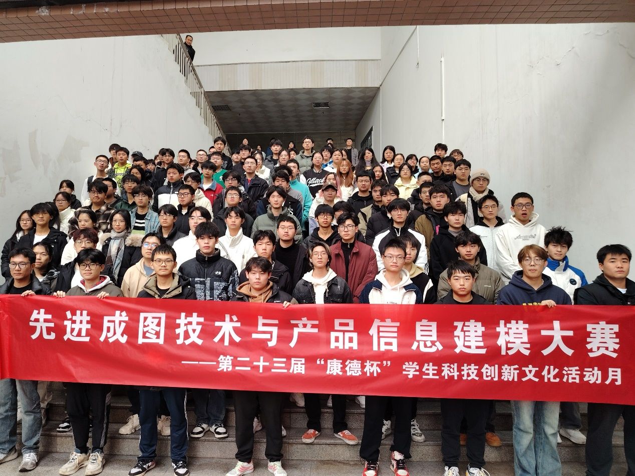 活动开始,参赛选手们在教学楼前集合并合影留念,随后进入赛场开始紧张而有序的比赛。本次大赛持续两个小时,考察内容涵盖机械制图基础知识、三维建模及创新设计能力,全面检验选手的专业素养和实际操作能力。