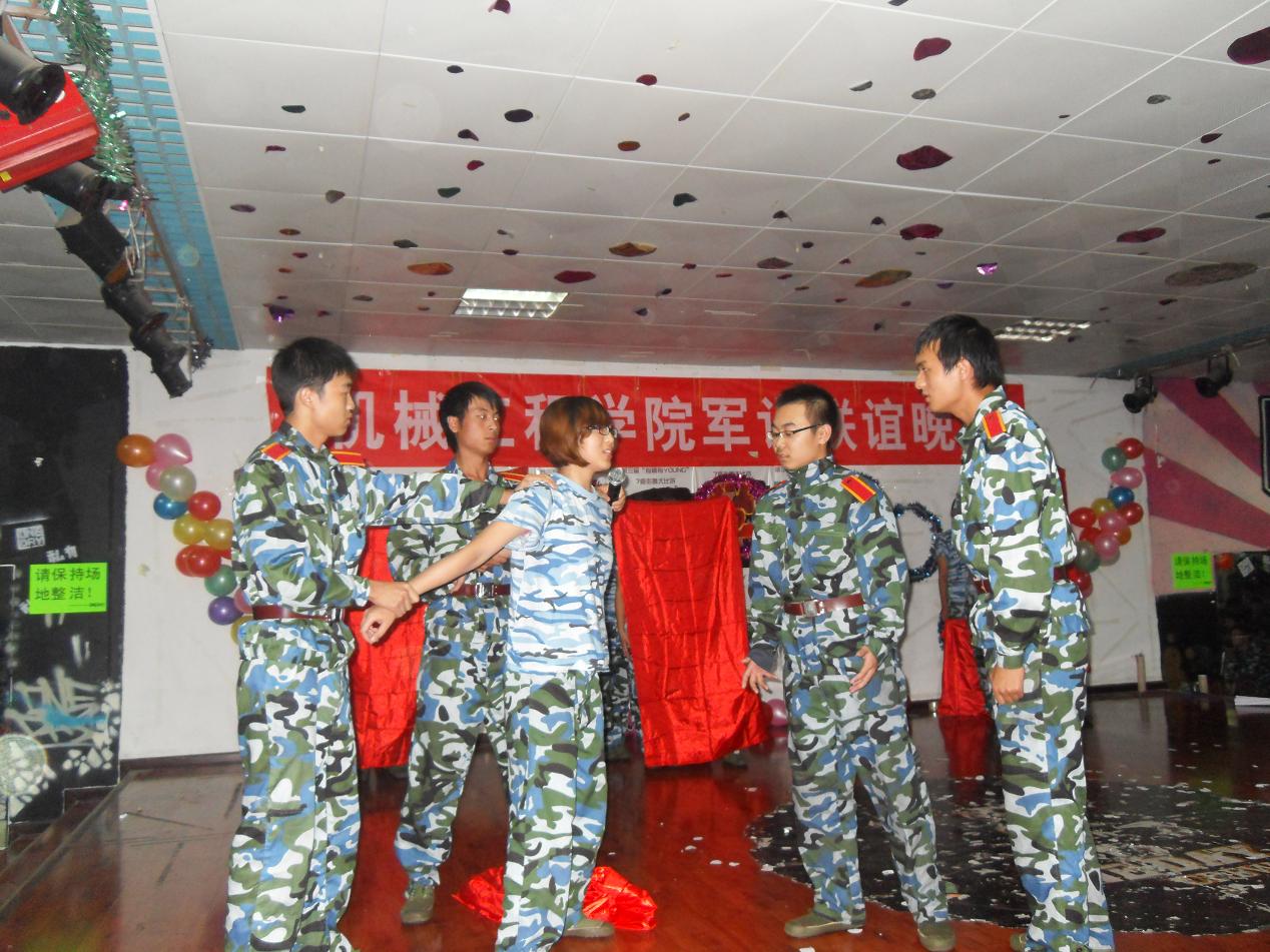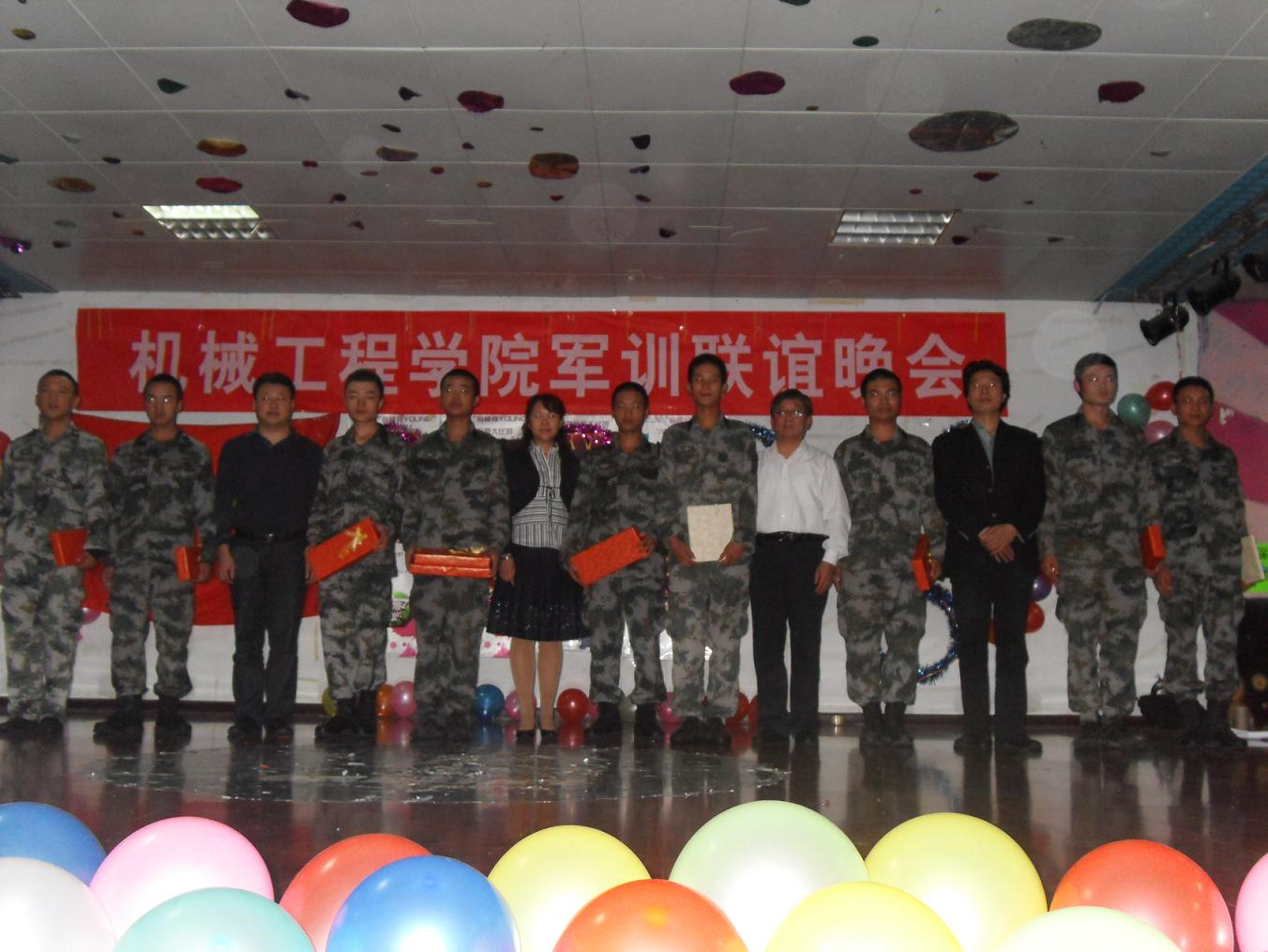 伴随着一首铿锵有力的黄河大合唱,晚会正式开始。首先,杨书记做了讲话,他对教官们在军训工作中的辛勤付出表示感谢,向军训的全体学员表示了慰问。他说,军训是大学生履行兵役的一种形式,是发扬艰苦奋斗作风和人才培养的好机会,他希望同学们能做到:1、艰苦奋斗,努力学习;2、学习教官好思想、好作风;3、认真向解放军学习纪律优良、作风严谨,为以后成才打下基础。接下来,学院的领导们为内务卫生优秀的寝室颁发了奖品。其后,怀着炽热感恩的心,学院为教官们送上了小礼物,全场响起了雷鸣般的掌声。在《红旗颂》、《血染映山红》等精彩的话剧中,我们感受到曾经流淌在这片土地上的革命者鲜红的血;在《朋友》、《讲不出再见》等歌曲中,我们互诉着与教官的兄弟情,同学们怀着满腔情感对着教官们说:教官辛苦了!在这激动的夜晚,呐喊声一波接着一波,将晚会推向了高潮。在《团结就是力量》的歌声中,晚会落下了帷幕。