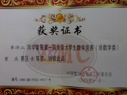 2009年11月,在全国数学竞赛预选赛中,季洋江以优异的成绩获得了重庆市非专业组一等奖。这次夺奖打响了即将迎来的硬仗中胜利的第一枪,更大的考验还在前方等着他――2010年5月全国数学竞赛决赛。