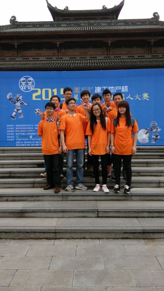 2015年5月16日至17日,重庆市“建工杯”第二届移动机器人大赛开幕。本次比赛由重庆市科学技术委员会和重庆市教育委员会主办,重庆市机器人与智能装备联盟和中国科学院重庆绿色智能技术研究院承办。全市各大小学,中学,大学齐聚园博园展示自己的成果。大学组比赛分为竞速赛和创意赛。此次重庆工商大学共派出了13名队员参赛,其中竞速赛4组共12人;创意赛1组共1人。经过两天的奋战,取得了创意赛三等奖的成绩。