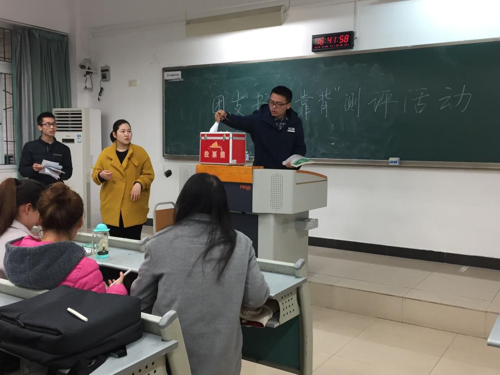 首先,邢老师介绍了团支部书记“背靠背”满意度测评活动的目标要求以及测评方式。接下来,团支书上台进行了简单的工作汇报,之后同学们依次上台进行公平、公正、公开的无记名投票。每位同学在独立填票区进行填票,对折后投入填票箱,一名同学投票结束,两米之外的同学才能进行填票环节,在每位学生投票结束后,摇一摇投票箱进行洗票。测评结果显示两班团支书的工作均完成得很好,得到了班上同学的一致好评。
