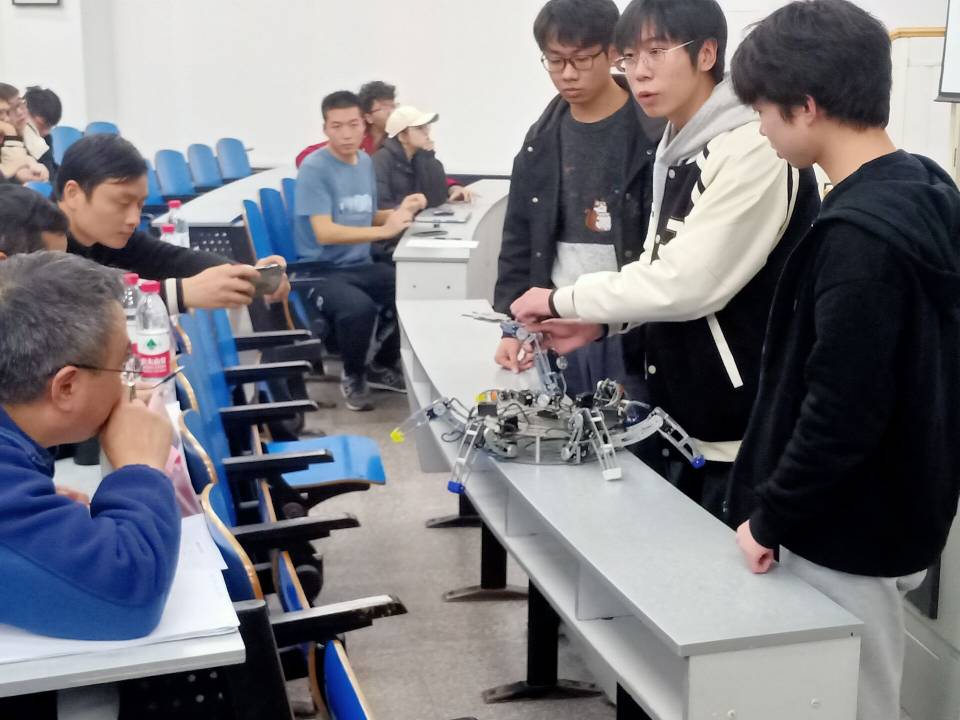 在比赛过程中,各组选手分别上台介绍团队的作品,阐述设计理念,评委老师实时提出分析和建议,并鼓励在场的所有参赛者共同分析、一起参与。此次参赛作品种类繁多,创意新颖,得到了评委老师的高度认可,其中突出的有仿生机械、环境保护治理机械等。全部小组展示答辩完毕后,评委老师根据各小组情况完成最终评分及排名。