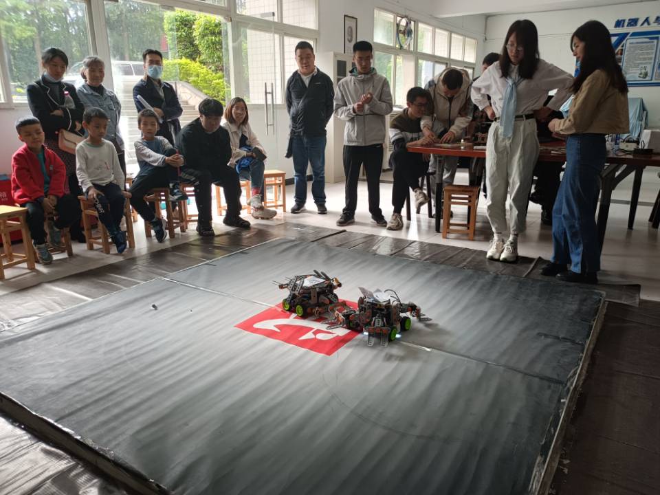 赛前,六组选手按照比赛前的抽签分组预先进行了组内循环赛,以积分制的形式角逐出选手排名。选手们将自己的机器放入比赛场地内,两组机器人在场地内进行着激烈的竞技。赛场上气氛焦灼,每一次竞技的胜利,都会带来选手们脸上难以掩盖的喜悦,每一次的失败也能带来不甘和遗憾,这也正是竞技比赛的魅力和意义所在!每组队员们辛勤付出,都享受着比赛的过程。有的小组队员激情澎湃,为自己在台上“战斗”的小车加油助威;有的小组队员面色凝重,正为自己机器人的突发状况而冥思苦想;还有的小组队员喜笑颜开,为自己的机器人获得的成绩感到发自内心的满足与高兴。