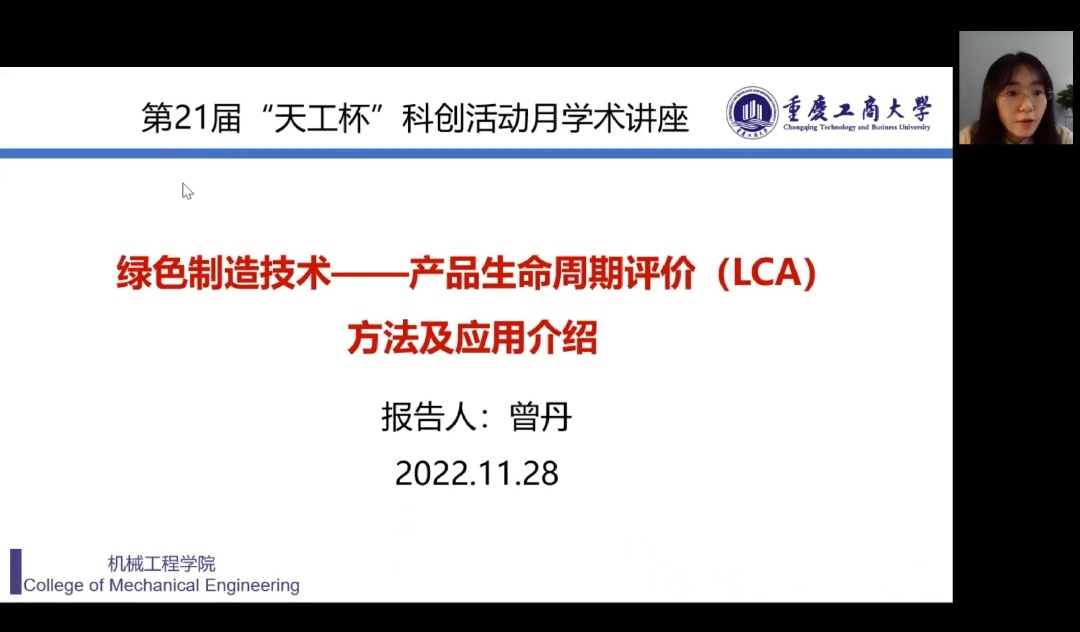 2022年11月28日,曾丹老师在线上开展了科技创新文化活动月“博士开讲啦”系列学术讲座--“绿色制造技术——产品生命周期评价方法LCA及应用”。曾老师主要讲述了三个板块的内容:碳中和含义以及全球碳达峰碳中和的现状、量化碳效率的工具——LCA、评估对象和系统边界的定义,清单分析和环境影响评价,讲座最后,曾丹老师提出LCA已成为企业,科研机构进行环境影响的重要工具,也在不断优化中更易被企业运用。此次讲座让同学们对于LCA将有初步的认知,激发对于学习的热情。