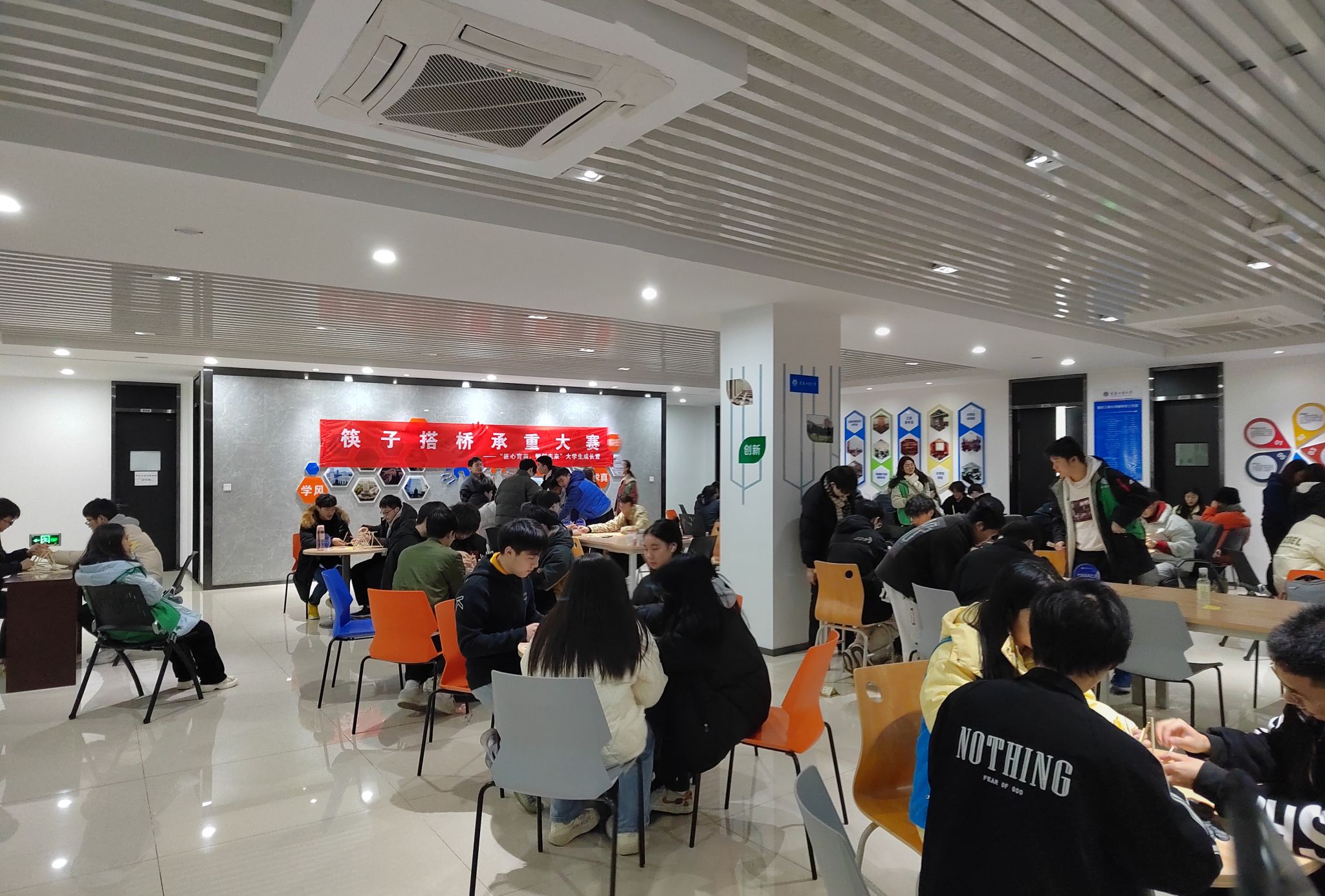 下午2时,“筷子搭桥承重大赛”在学生发展中心大厅拉开帷幕,共34支跨专业队伍参与。各参赛小组在有限时间内利用橡皮筋与筷子构建承重结构,并接受以瓶装矿泉水为单位的逐级加载测试。比赛中,同学们不断尝试、调整与优化结构方案,充分体现了专注思考、团队协作与精益求精的“工匠”精神。经激烈角逐,第2组与第17组分别以98瓶与60瓶的优异成绩荣获一等奖,另有10支队伍分获二、三等奖。