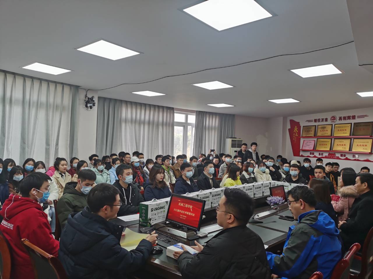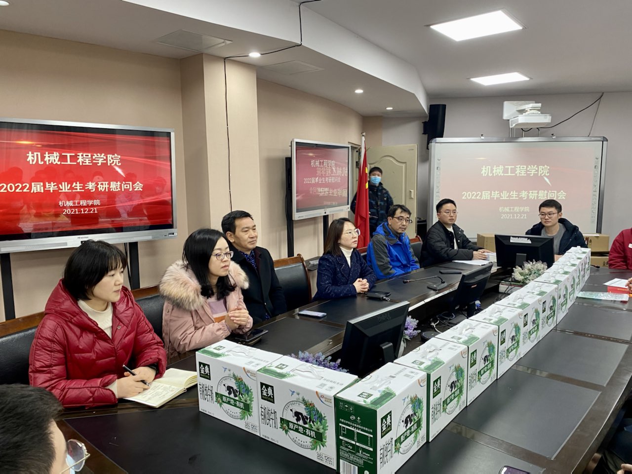 2022届学生考研在即,为给考研学子加油鼓劲,12月21日中午,122cc太阳集成游戏在90708会议室开展2022年考研慰问活动。学院党委书记杨娟、副院长杨祖彬、副院长李平、学院学工办主任刘静、辅导员邢月军、周利民、郭伟以及2022届考研学生参加本次活动。