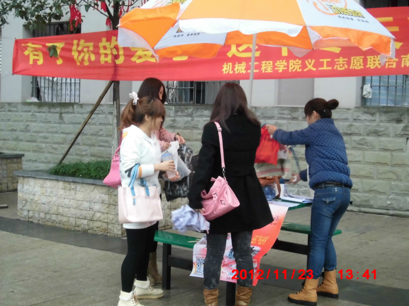 2012年11月22、23日,重庆工商大学122cc太阳集成游戏义工志愿者协会发起了“衣旧情深,节用惜福”捐赠衣物,关爱山区留守儿童的活动。接下来的两天时间,分别在主校区菊园食堂前、南2宿舍和北10宿舍楼下、新北区等多个地点举行捐赠活动。天气虽然下着小雨,却丝毫没有减少志愿者的热情。前来捐赠衣物的同学,他们捐的小到一把伞,大到几袋的衣服,两天里,爱心没有断过线,许多的志愿者也牺牲自己中午休息和吃晚饭的时间帮着整理同学们捐赠的衣物。大家奉献的爱心,让这个飘雨的冬天变得格外温馨。最后,义工志愿者将所有的衣服整理打包,送上了开往贫困山区的车,活动也在温暖的氛围中圆满的结束了。