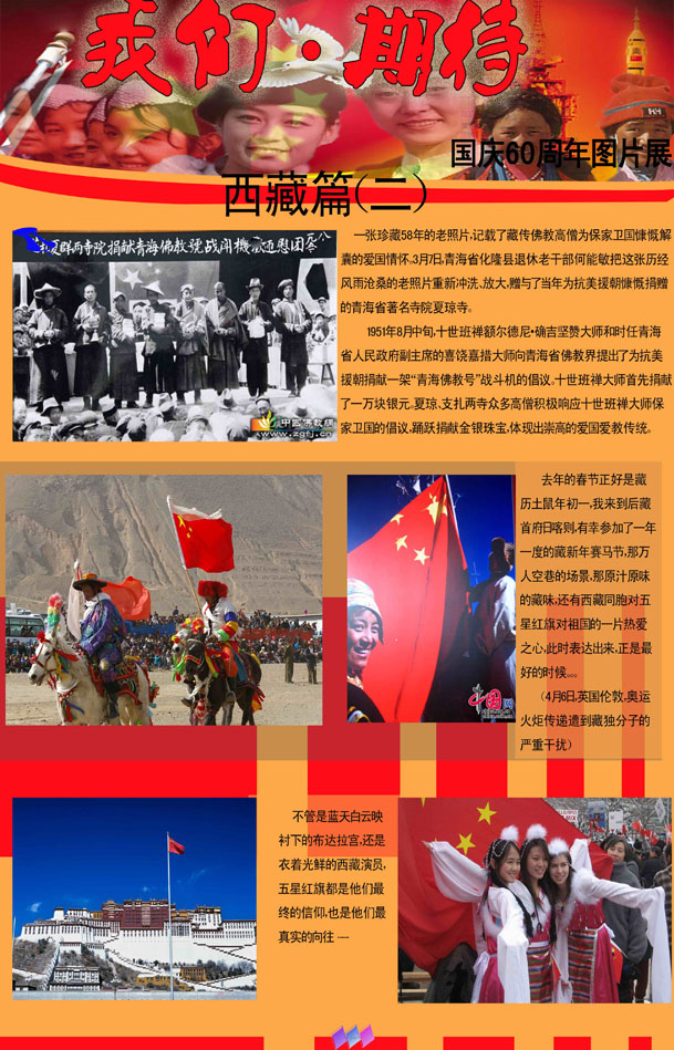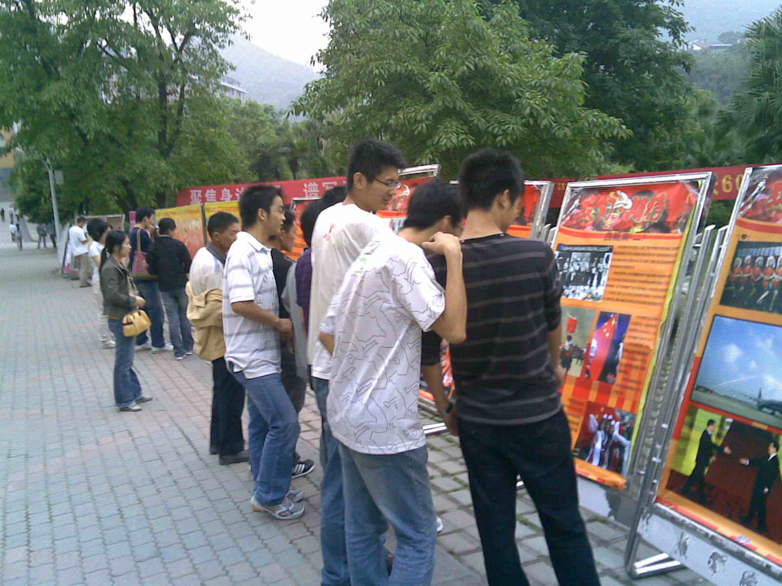 图片展内容涉及大陆篇、西藏篇以及台湾篇等几大板块。大陆篇以鲜明的图文说明展示了共和国六十年来的沧桑巨变,昭示了共和国由贫穷落后的局面到繁荣富强的奇迹般变化。从中可以看出一个飞速发展的强大共和国,正在令世界震撼。西藏篇和台湾篇则图文并茂地反映了西藏与内地、台湾与大陆之间的经济发展与友好往来。特别是西藏篇,真是地反映了西藏由几十年前的农奴社会制度下的悲惨命运到现在繁荣发展的铁的事实,证明只有在祖国这个温暖的大家庭中西藏才能稳定持续发展,也昭示了一切企图分裂祖国的藏独与台独势力都必将灭亡。祖国统一的美好宏伟蓝图必将实现。因这次活动以新颖独特的图片形式反映了爱国的主题。在食堂门口展出的这几天引起了广大师生的广泛关注,上前围观的人员络绎不绝,很多同学用拍照的方法留下这些值得珍藏的图片。。。
