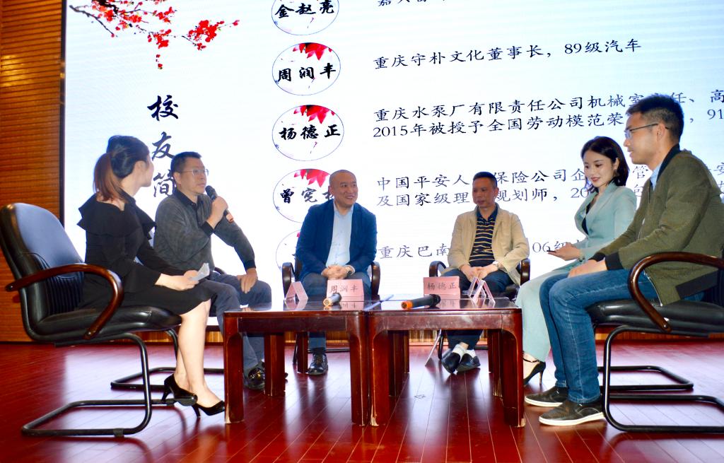 启动仪式后开展了“校友与你面对面”主题分享活动。 此次活动邀请的校友为89级机制专业嘉兴富海投资管理有限公司董事长金赵亮,89级汽车专业重庆守朴文化董事长周润丰,91级机制专业重庆水泵厂有限责任公司机械室主任、高级工程师,全国劳动模范杨德正,03级包装专业任中国平安人寿保险公司企业高管的曾宪林,06级机制专业就职于重庆市巴南区建委的杨扬。五位校友分别分享了他们学生时代工作后的经历,也对学生们提出了自律、好学、团结、阳光、严谨的期望,希望学生们能从专业学习过程中找到价值感、成就感,呼吁学生们用心了解专业,感受专业,热爱专业,脚踏实地走好每一步,着眼当下,展望未来,不断积淀历练。本次学生科技创新文化活动月全程由校友赞助。