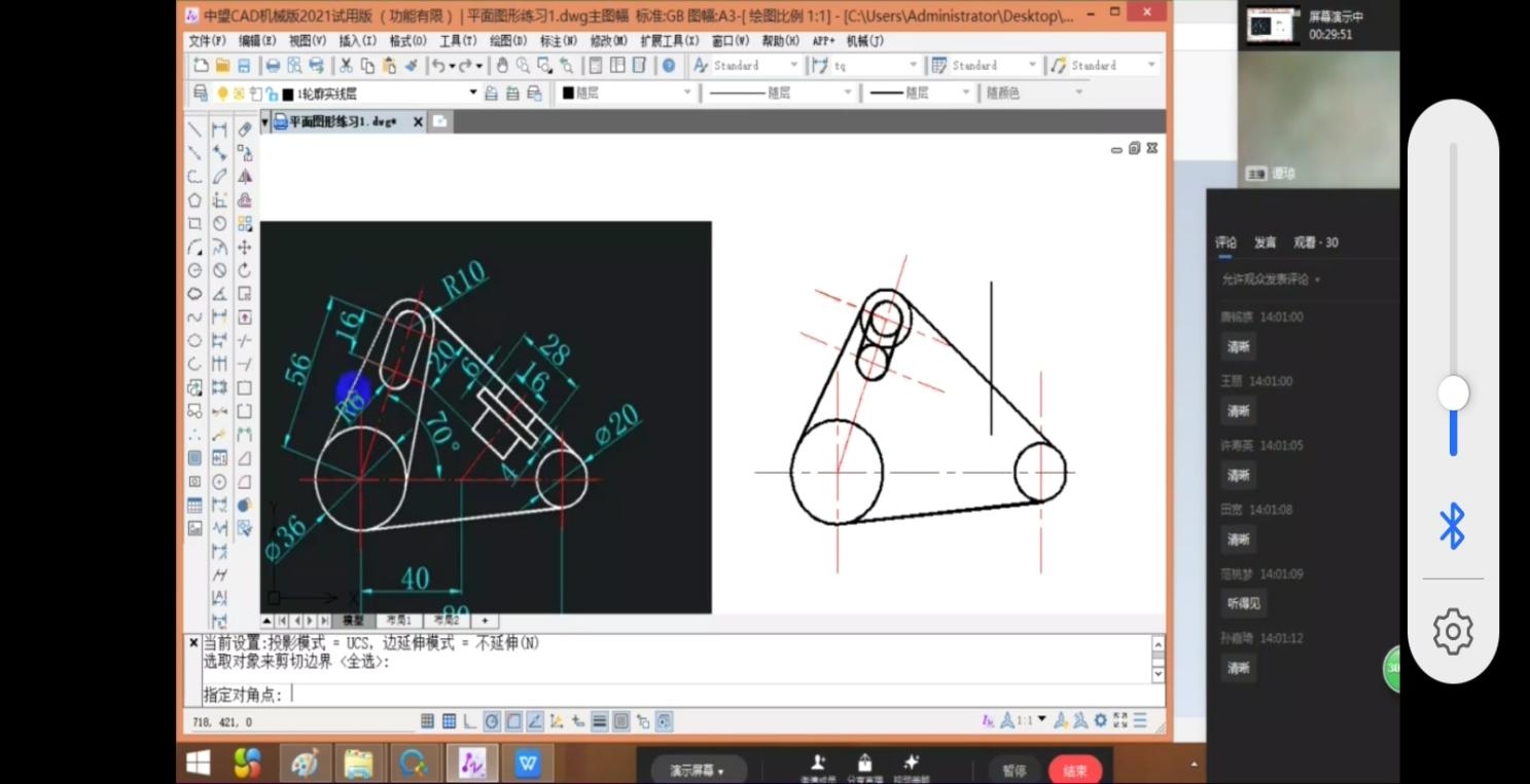 CAD软件是未来不可或缺的“合作伙伴”,它不仅能提高学生的绘图水平和专业技能,还可以进一步培养勤奋、严谨、求实、创新、的良好学习风气。在CAD制图强化专场培训中,谭琼老师结合实例介绍了绘图命令和编辑命令的使用技巧,尺寸标注、公差以及粗糙度。参训学生一边观看直播,一边用电脑进行软件命令操作。通过这种方式,尽管是线上教学,却也丝毫不影响学生学习和掌握中望CAD软件命令的操作。当遇到困难或者不理解的地方,同学们会通过弹幕发送疑问,然后谭琼老师给同学们一一解答。在疫情背景下,这种培训方式受到了参训学生们的一致好评。