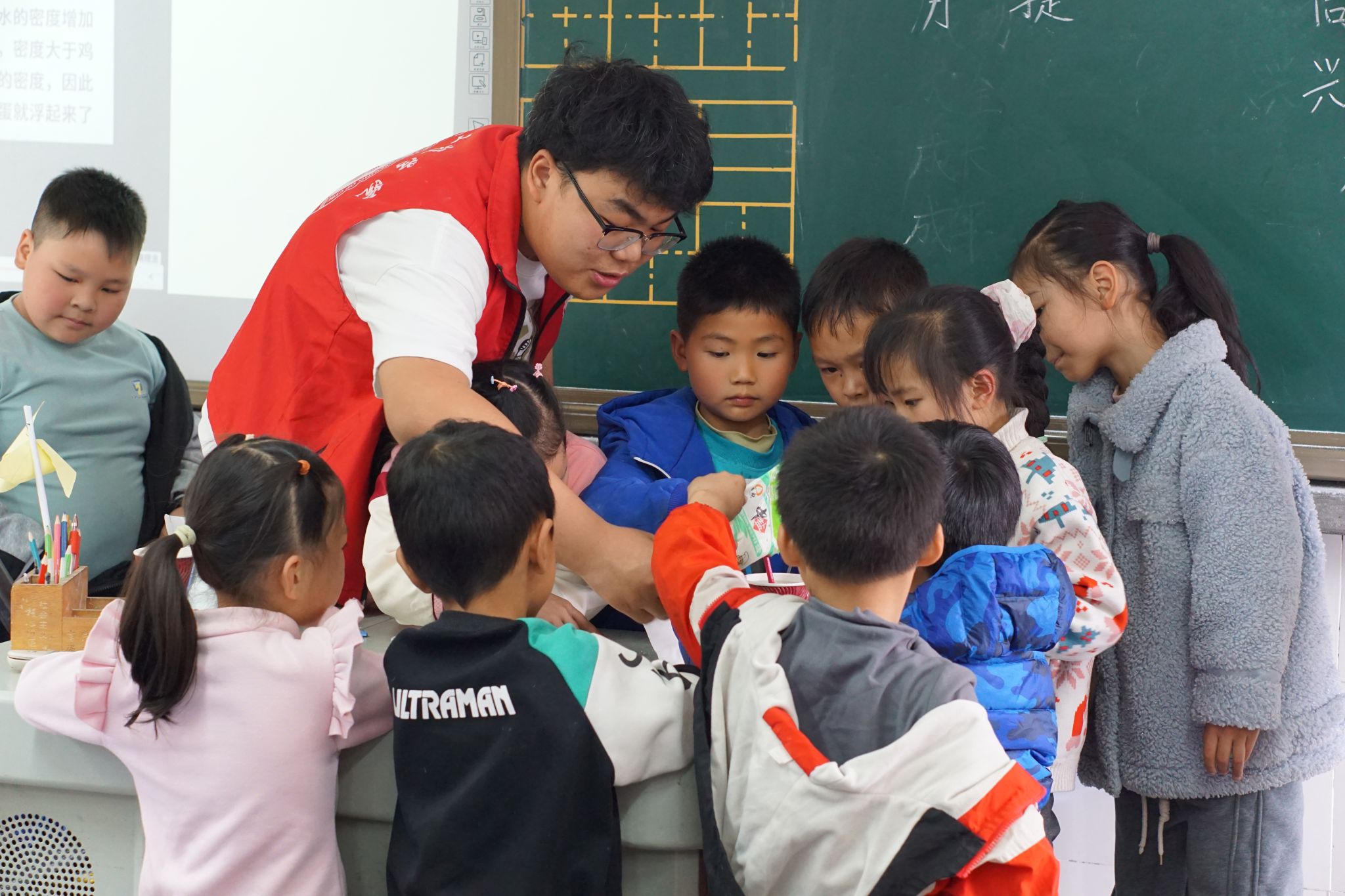 为有效推动乡村儿童服务高质量发展,志愿者服务队积极吸取班级内先进分子,实现支教经验的传承和志愿精神的赓续;同时精心打磨课程教育体系,护航乡村儿童健康成长。激光切割、盐水鸡蛋漂浮实验……趣味盎然的实验为孩子们打开了触摸科学、爱上科学的窗口,也在他们心中播撒下了科技的种子。