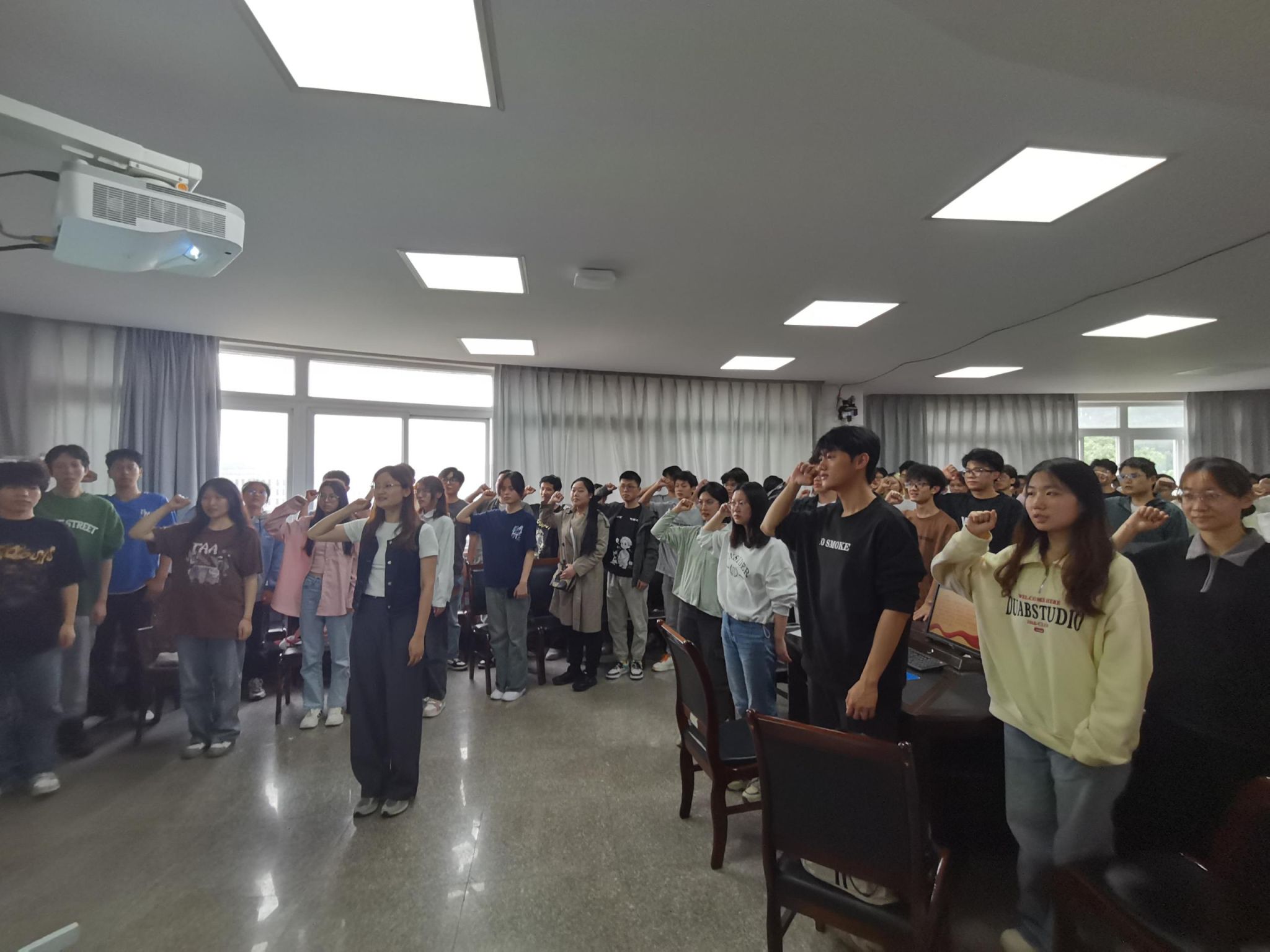最后,学院资助工作负责人余洋带领同学们进行了诚信宣誓。同学们目光坚定,语言铿锵有力,宣告着诚信立身、清廉做人的信心与决心。诚信宣誓结束后,同学们踊跃的签订了诚信教育承诺书。