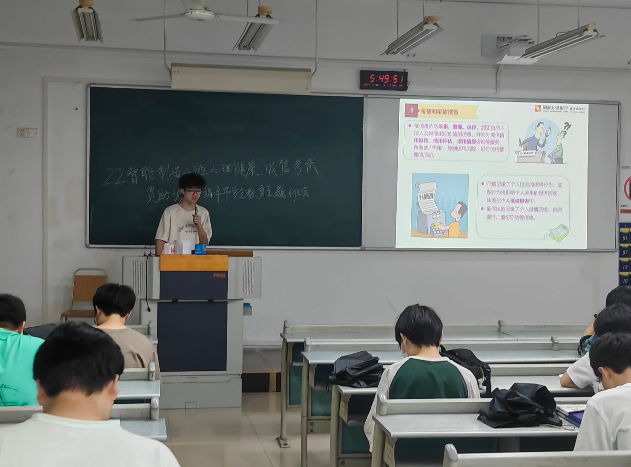 随后,陈春洁从感恩、诚信、清廉三个方面开展教育。首先,他强调同学们作为国家多年以来资助政策安排的直接受益者,应懂得知恩、感恩和报恩,每一年,国家安排财政资金直接资助700多亿元,安排助学贷款贴息100多亿元,安排临时困难补助和各种项目资助也是不小的数目,党和国家这种种的制度安排,保证了每一同学不因为资金困难而错过可以接受的高等教育。各位同学应懂得感恩党和国家的资助,助力了大家更好地发展与成长,更希望大家未来能传递这种恩情,切实落实感党恩、听党话,跟党走!其次,作为机械工科学生,要结合学科专业特点,树诚信意识,一步一个脚印诚实守信地走好职业生涯路,特别强调诚信、责任和担当这三个机械工程伦理的关键词,同时提醒有助学贷款的毕业生,要做到诚信还贷,共同打造诚信校园!最后,陈春洁着重给同学们强调了廉洁文化建设的必要性和重要性,引导同学们从现在开始、从身边事开始提高廉洁认识,积极将廉洁文化教育纳入自身成长成才全过程,踏实做事,清廉做人。