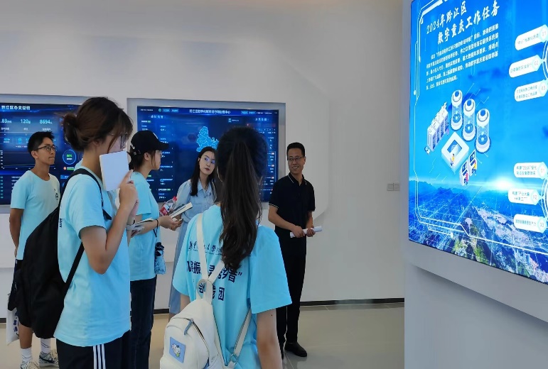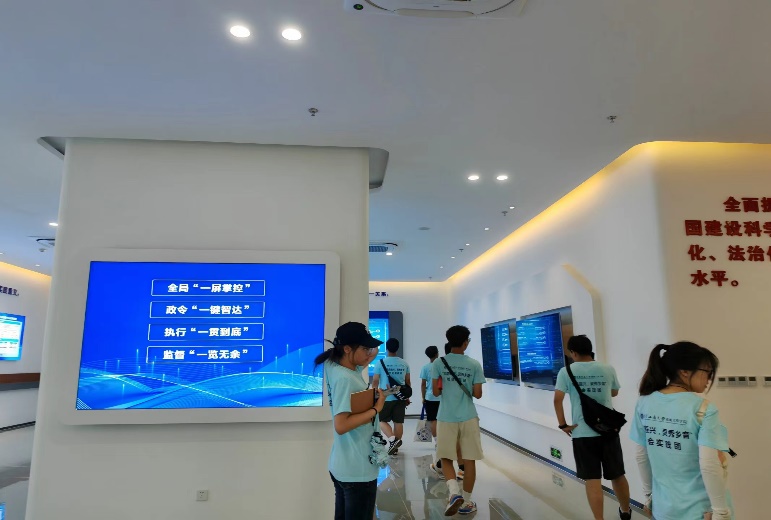 紧接着,讲解员就数字治理中心的治理体系和治理能力现代化进程为实践团成员们进行讲解。她从社区治理联动化、边区治理高效化、居民安全重视化等方面,从地区的治理到居民安全保障,深入浅出的介绍了数字治理在这一系列工作中展现的优势——及时性、高效性、共享性,黔江区也以这些资源建立起了一个高效率的数字化治理体系,在为社区的工作中发光发热。