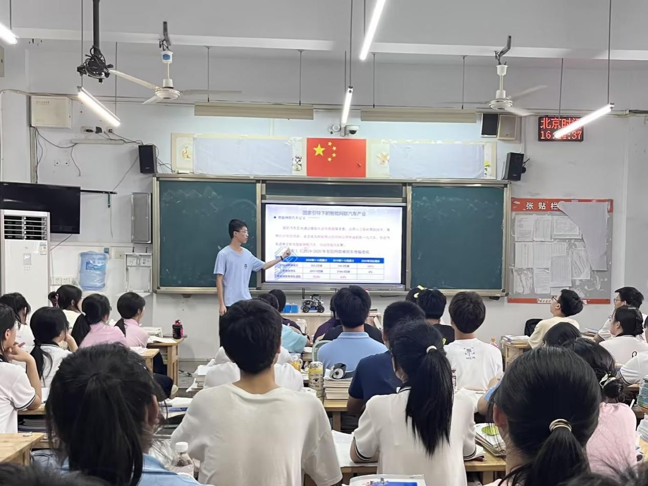 在科技日新月异的今天,智能汽车作为未来出行的重要趋势,正以前所未有的速度改变着我们的生活方式。为积极响应时代号召,激发青少年对科技创新的热情,重庆工商大学122cc太阳集成游戏“绿色心连心,智慧社区行”社会实践团于7月9日走进重庆市涪陵第五中学,成功举办了一场别开生面的智能汽车科普课堂,为高三学子们带来了一场科技与梦想的盛宴。