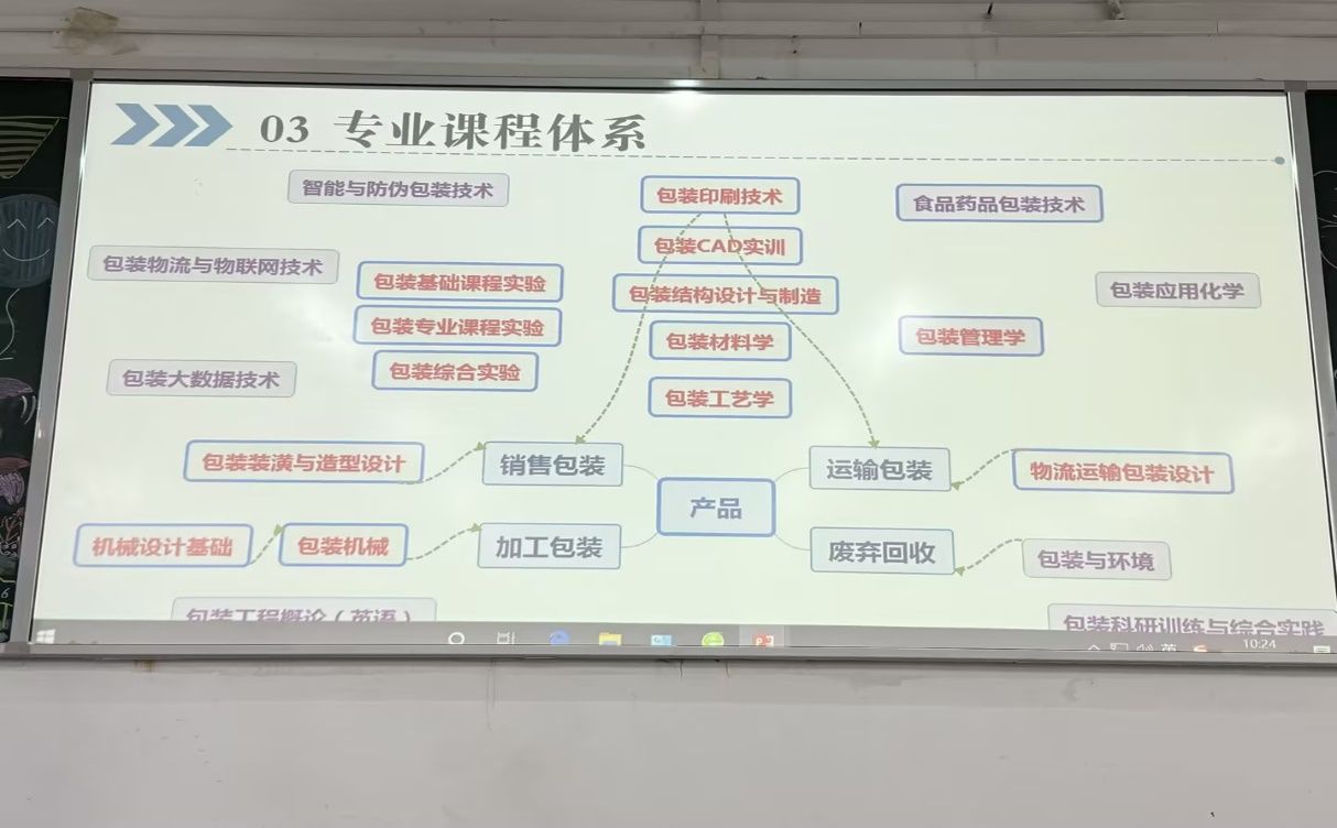 第三模块是专业课程体系。张老师介绍了关于包装工程专业的专业课程体系,从基础到产品,专业已有成熟体系,同学们明显更进一步了解专业。