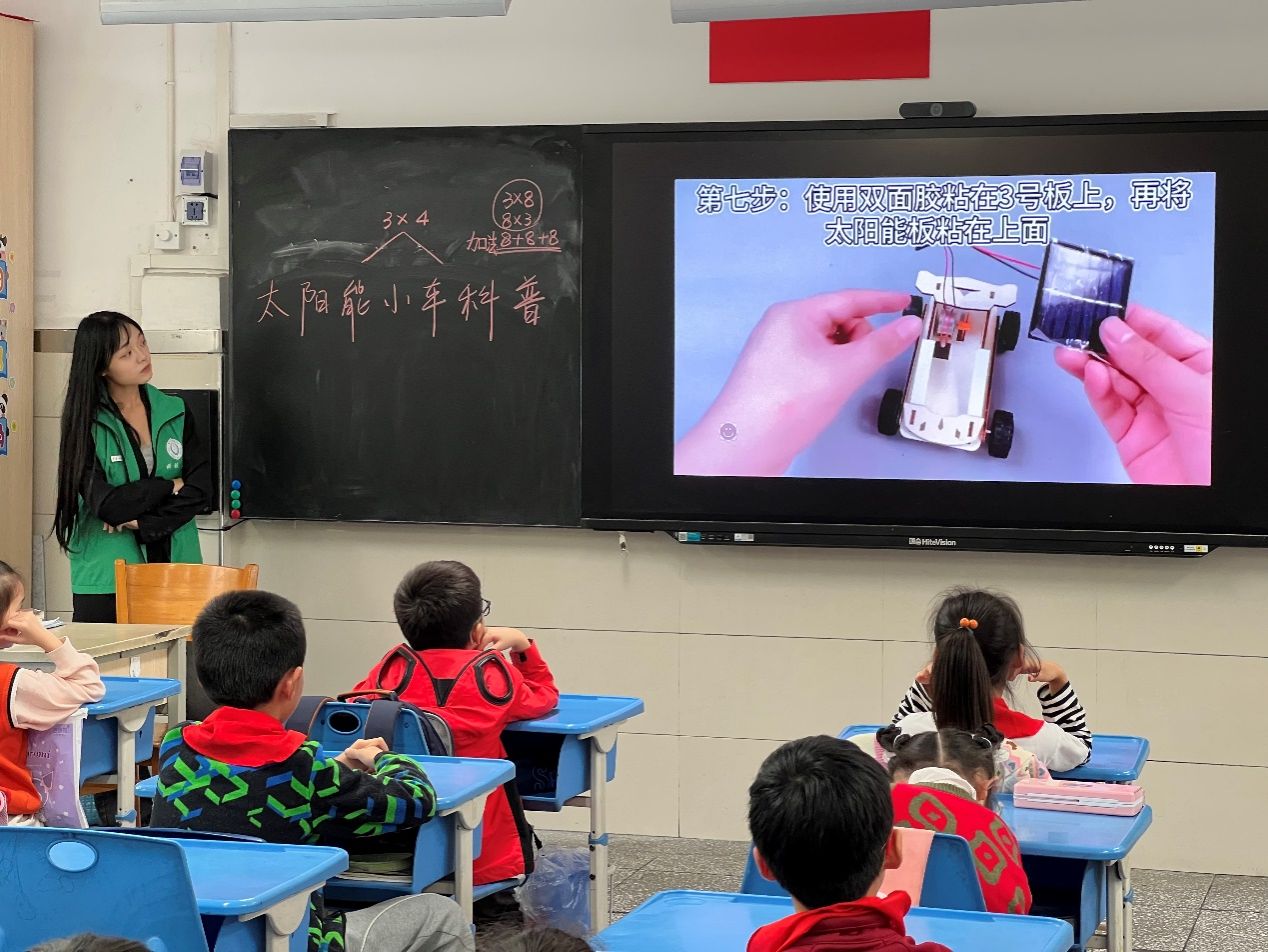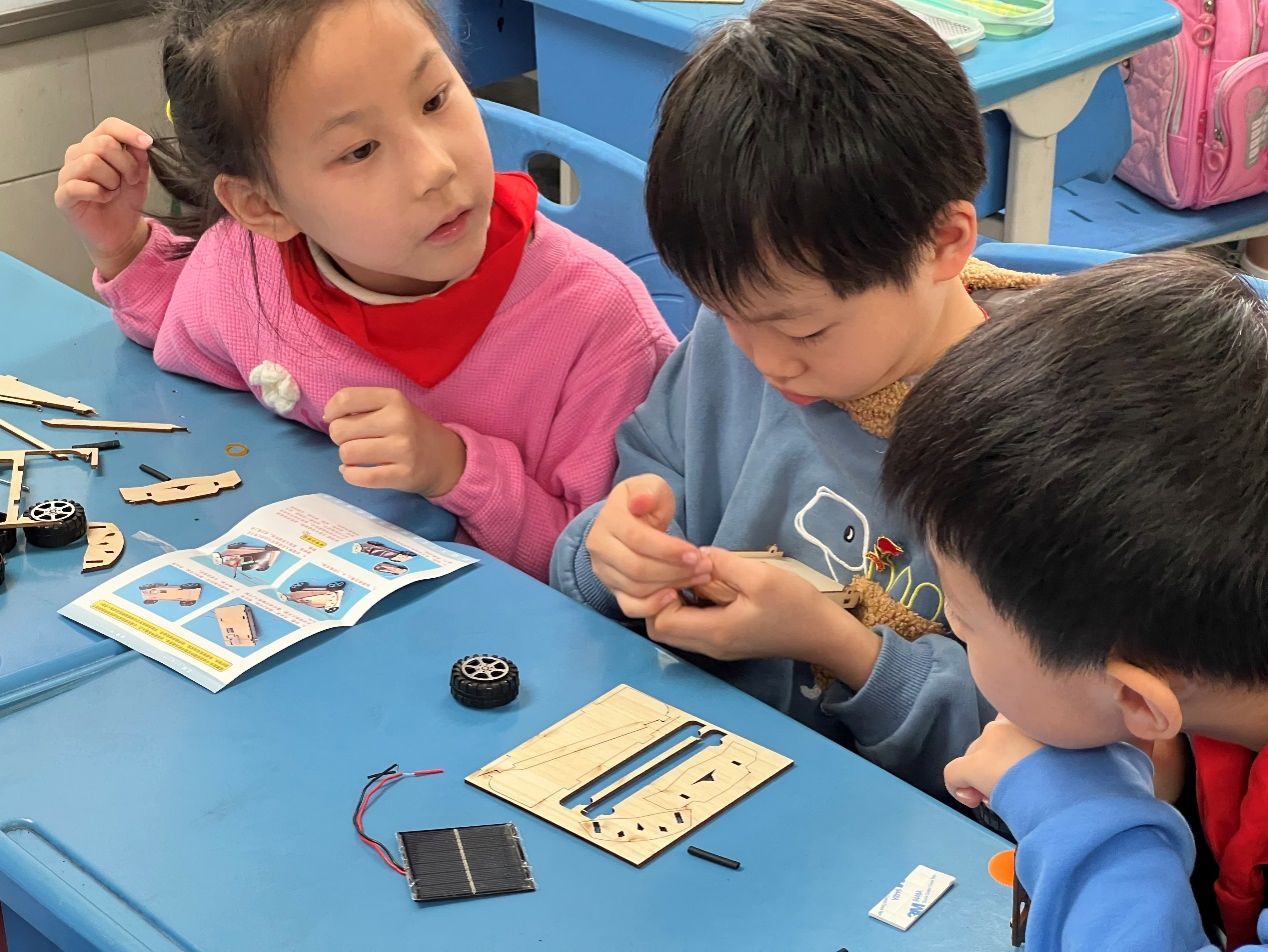 太阳能小车拼装活动。讲师们从基础的机械原理到太阳能电池板的安装,耐心指导学生们在实践中学习到了科学知识。通过团队合作,每组学生都成功组装出了自己的太阳能小车,并在学校的操场上进行了试跑,场面十分热闹。
