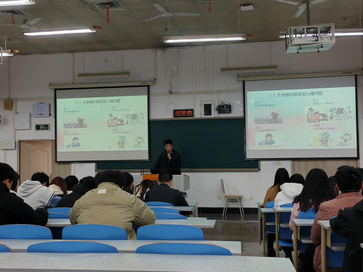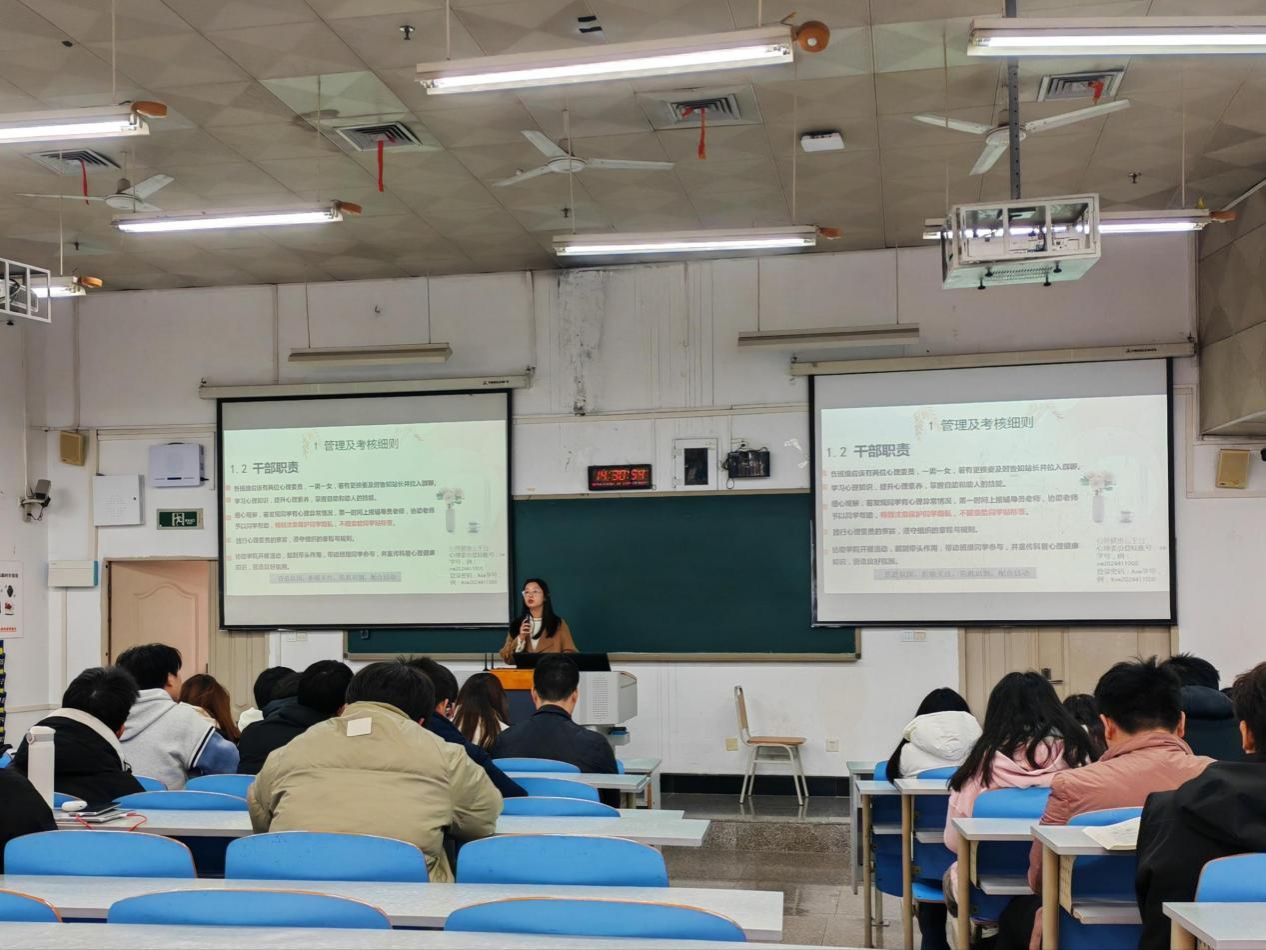 接着,心理工作站站长邹武宏为大家带来了一场生动实用的心理委员培训。他首先明确了心理委员的角色定位与职责范围,随后详细介绍了一些常见的心理问题及其识别方法,帮助大家更好地理解和把握大学生的心理特征。此外,他还分享了大学各阶段可能出现的心理问题以及心理危机的识别与应对策略,并展示了多种心理援助的途径与资源,为心理委员提供了宝贵的服务指南。