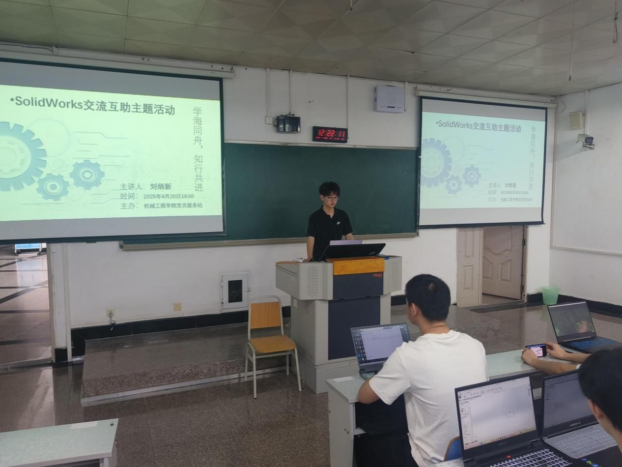 2025年4月20日下午,重庆工商大学122cc太阳集成游戏党员服务站在慧智楼90209教室成功开展"学海同舟,知行共进"互助学习系列活动之SolidWorks建模专题培训。活动特邀重庆市大学生先进成图技术大赛二等奖获得者——23级机电一班刘炳新同学担任主讲,采用"线下实操+线上直播"双模式同步进行,累计吸引百余位同学参与学习。