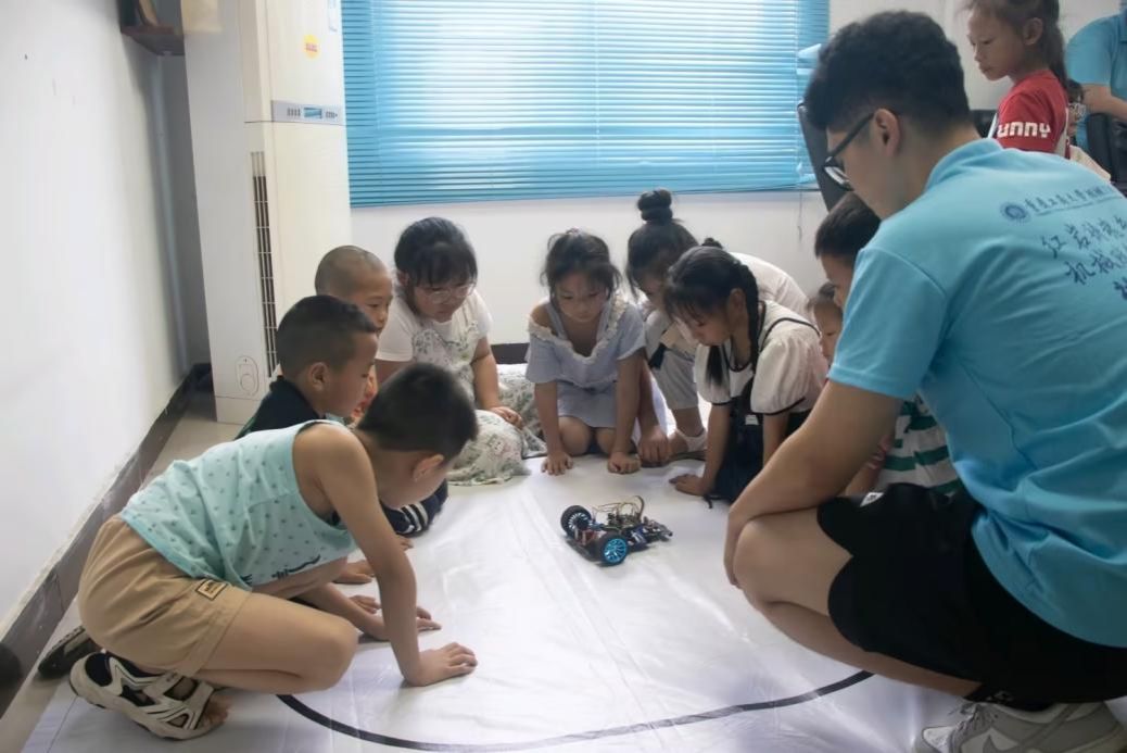为满足孩子们的求知欲,实践团设置了“小车赛道挑战”互动环节。孩子们分组操控小车,在蜿蜒曲折的路线上测试行驶稳定性,在反复调试中探索传感器灵敏度与行驶速度的关系。“原来改变传感器角度,小车转弯更灵活!”一位小朋友兴奋地分享自己的发现。课堂上,孩子们不仅直观感受到智能控制技术的应用,更在动手实践中初步理解了编程逻辑与机械联动的奥秘。