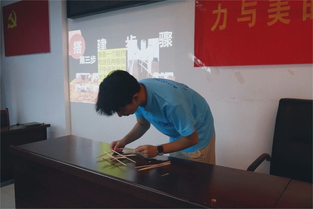 实践环节将课堂推向高潮。30余名学生分为6组,在团队协作中展开创意比拼。面对“仅用一次性筷子、胶水和棉线搭建承重桥梁”的挑战,小工程师们迅速进入状态:第一组采用“三角桁架结构”,强调稳定性;第二组尝试“双层拱形设计”,追求承重极限;第三组别出心裁地融入“彩虹斜拉桥”造型,兼顾美学与功能。过程中,实践团成员穿梭于各组之间,手把手指导“结构对称性调整”“节点加固技巧”,并提醒学生关注“材料利用率”——“每一根筷子都是资源,如何用最少的材料实现最优性能?”这一环保理念引发学生深思。