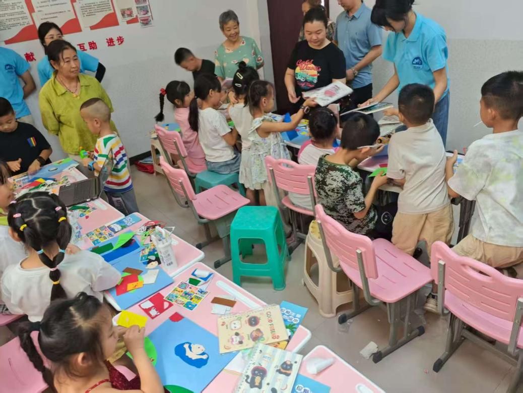 问答环节结束后,成员们又给孩子们分发精心准备的防溺水主题剪贴画,简单的操作方法与多样的色彩搭配很快吸引了孩子们的注意力。在成员们的指导下,大家很快就完成了自己的作品。团队巧妙地通过将防溺水教育和美术手工结合的方式让枯燥的知识变得更加生动有趣,让防溺水知识深深扎根孩子们的心间。