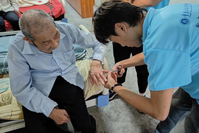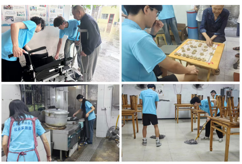 风雨无阻,用青春暖阳映桑榆。“雨再大,也不能忘记和老人们的约定”,面对重庆突发的特大暴雨,服务队克服交通困难,坚持按原定计划于清晨7时出发前往敬老院。抵达后,队员们立即分组开展服务工作:一组负责厨房区域,对餐具进行系统清洗和高温消毒;一组重点清洁公共区域,清除餐桌油渍,拖干走廊积水;另一组则协助整理老人居室,改善生活环境。这支身着蓝色制服的志愿者服务队,受到敬老院老人们的热烈欢迎。在完成环境整治工作后,队员们细致地为老人们修剪指甲、整理轮椅,耐心陪伴聊天,并与老人开展棋类活动,用实际行动传递温暖与关怀。