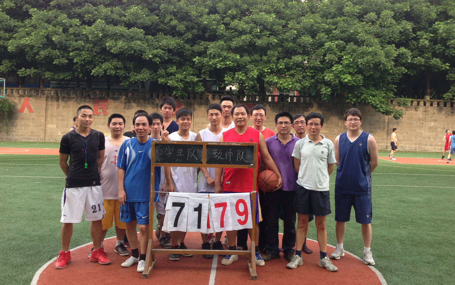 这次师生篮球告别赛,学院领导非常重视,在学院工会的精心策划下协调,动员了教职工中的精兵强将,建成了一支有战斗力的球队。学生也做了细致安排,每个毕业生班级都派队员参加了这场比赛;并组建了啦啦队在比赛场地周围喝彩。在周末的一个下午4点半钟,随着“哔哔”的一声长哨吹响,一年一度的师生篮球告别赛开赛啦。比赛一开始,老师队卯足了干劲,想打个把学生措手不及,争取主动;然而,学生年轻气盛,体力充沛,稳扎稳打,比分连连升高。经过半场的激烈拼打,毕业生队已完全掌握主动权。比分出现一边倒,急得到场助威的学生拉拉队也为教师对着急,连连为教师队助威:老师加油!老师加油!。看到老师队体力不支,毕业生队也放慢了比赛节奏,老师队趁机换人反攻,逐渐把比分拉近。最终,老师队以71:79的8分之差再次败给学生队。