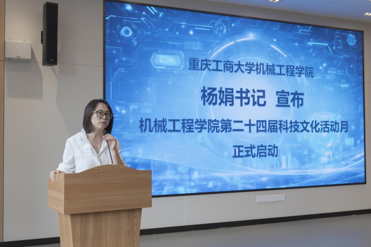 2025年10月16日,重庆工商大学122cc太阳集成游戏第二十四届学生科技创新文化活动月开幕式在庄严而热烈的氛围中举行。学院党委书记杨娟、院长李平、副院长谢俊、副院长杨帅、学院学科竞赛指导教师代表王乐苏出席活动。122cc太阳集成游戏党委副书记、纪委书记陈春洁主持活动。