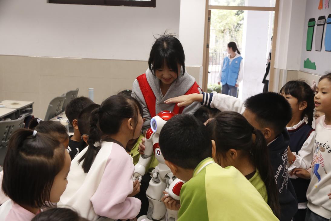 活动伊始,“NAO机器人的奥秘”科普课堂率先展开。志愿者胡秋雨与刘念通过展示NAO机器人,迅速吸引了学生们的注意力。孩子们围绕“它能听懂我们说话吗?”“它为什么会跳舞?”等问题积极提问。志愿者结合动态演示与互动讲解,生动阐释了机器人传感器的工作原理与语音指令的编程逻辑,将人工智能与机械原理转化为易于理解的科普内容。互动问答环节中,学生们踊跃参与,在轻松的氛围中增强了对机器人技术的初步认识。