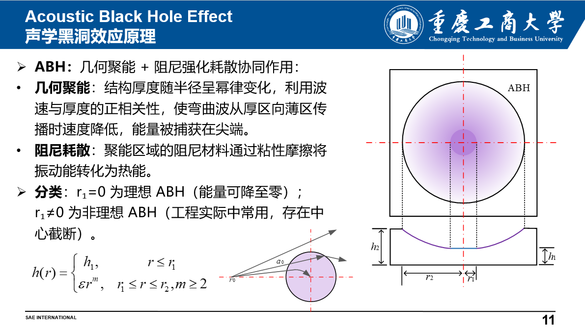 讲座中,张云飞博士深入剖析了当前车辆轻量化设计中的减振降噪难题。他指出,随着纯电与混动汽车的普及,轻量化已成为行业核心趋势,然而传统降噪手段往往伴随重量增加,尤其在中低频路噪控制方面效果有限。针对这一痛点,张博士提出了基于声学黑洞(ABH)结构的创新解决方案。该结构通过“几何能量集中+阻尼增强耗散”机制,利用变厚度板引导振动波向中心汇聚并高效耗散,实现在不增加重量的前提下达成宽频降噪。