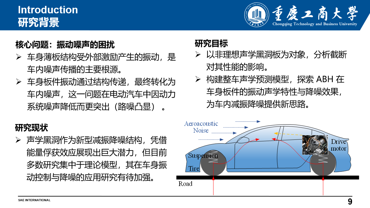 在实验仿真探索环节,张博士介绍了团队的系统研究过程。通过COMSOL软件构建钢板模型,并完成精细化网格划分与边界条件设置,团队成功验证了ABH结构在450–720赫兹频段的能量聚集效应。此外,研究团队以特斯拉Model 3为对象,采用混合有限元—统计能量分析法(Hybrid FE-SEA),构建整车声学中-高频高效预测模型。