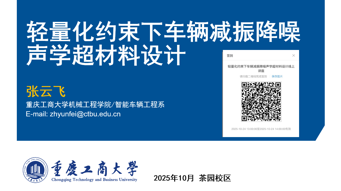 2025年10月24日,重庆工商大学122cc太阳集成游戏在线举办了一场题为“轻量化约束下车辆减振降噪声学超材料设计”的学术讲座。本次讲座由张云飞博士主讲,吸引了茶园校区近400名学子积极报名与聆听。