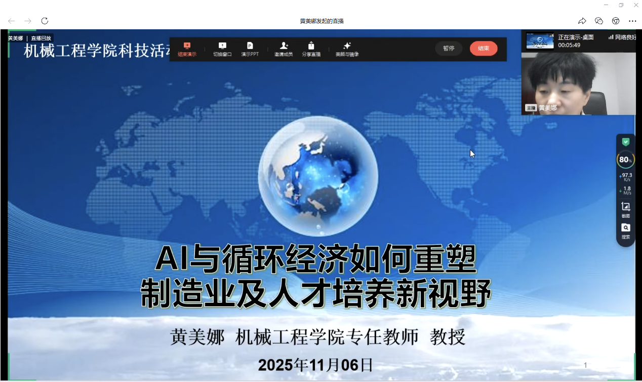 2025年11月6日,黄美娜老师在线上开展了“博士开讲啦”系列学术讲座——“AI与循环经济如何重塑制造业及人才培养新视野”。黄老师先以2025年中国制造亮眼成就切入,抛出AI与循环经济双重浪潮下传统制造业转型的核心议题;再解读双碳目标与科技革命的驱动作用,分享三个最新融合案例,回应学生对知识价值、职业边界的关切;最后指出传统工程教育的不足,给出跨界学习、驾驭AI工具等人才培养建议,寄语学生成为践行循环理念的新一代工程领袖。此次讲座不仅为学生指明了个人发展方向,也为高校人才培养改革提供了新思路。参与学生表示,讲座帮助自己理清了时代变革下的发展路径,将主动调整学习方向,提升跨界整合与创新实践能力,为制造业高质量发展贡献青春力量。