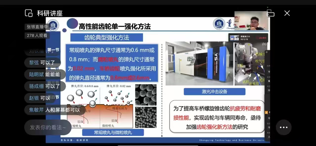 2025年11月6日,张银老师在线上开展了“博士开讲啦”系列学术讲座——“高性能重载车桥齿轮表面强化技术研究”。 张老师先点明重载车桥螺旋锥齿轮工况恶劣、易早期疲劳失效的行业痛点;再介绍现有单一强化工艺的局限性,提出感应加热辅助喷丸复合强化技术;最后展示实验成果,说明该工艺能优化齿轮表层微观结构,提升耐磨与抗疲劳性能,为重载车桥齿轮长寿命设计提供技术支撑。本次讲座聚焦重载车桥齿轮强化技术痛点,提出感应加热辅助喷丸复合强化工艺并展示实验成效,既突破了单一强化工艺的局限,为齿轮长寿命设计提供了实用技术支撑,也为相关领域科研与工程应用提供了新思路,助力提升重载车辆核心部件可靠性与耐久性。