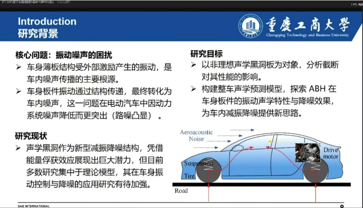 2025年10月30日,黄琳森老师在线上开展了“博士开讲啦”系列学术讲座——“声学技术在汽车中的应用”。黄老师先介绍声学的交叉性,指出其可结合多学科解决汽车噪声、振动等问题,说明技术能压缩汽车噪声分贝区间;再展示了声学技术在汽车中的实践应用,重点介绍AVAS、ASC等成果及可行性;最后总结研究结论,指出未来汽车声学将聚焦扬声器与激励器改良,强化新能源智能汽车个性化特征。本次讲座从学术理论、工程实践到未来展望层层递进,展现了重庆工商大学在智能车辆工程领域的科技实力以及创新能力,也为师生搭建了学术交流与创新实践的桥梁。参与师生纷纷表示,讲座内容新颖前沿,落在实处,为相关专业知识的学习与研究提供了深刻启发,对推动车辆工程领域的急速创新与人才培养具有积极意义。