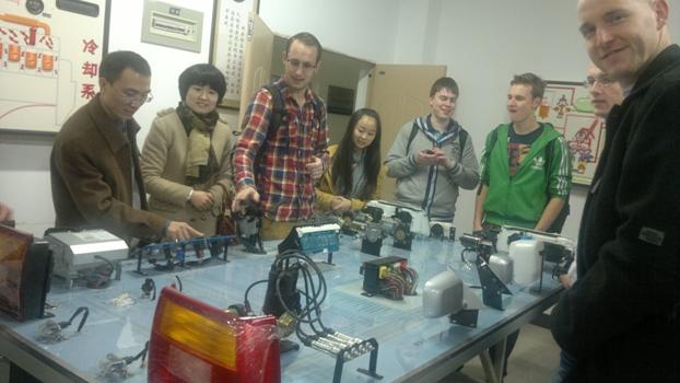 第三届全国大学生工程训练综合能力竞赛比赛在即,学院参赛学生与荷方学生将共同组队参赛。早在荷方学生来院之前双方已通过电子邮件对比赛的相关情况进行了沟通。荷方在来院交流期间,双方学生在实验室里面对面地交流,共同研讨参赛作品方案。双方的交流虽然存在一定的语言障碍,但以“机构运动简图”为桥梁,基本达到互相沟通的目的。荷方学生对参赛作品的方案提出了几点建设性意见,如量化分析能量损耗最大系统等。我院参赛学生杨杰表示,在此次交流活动中收获良多,荷兰学生强大的动手能力与逻辑思维能力给他留下了深刻印象。他们善于将实际问题理论化分析,理论问题联系实际解决,这都是我们中国学生需要学习的。双方同学都期待以后的交流能有更长的时间,并且约定明年将邀请荷方学生全程参与此项赛事。