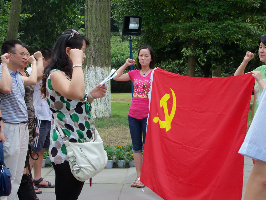 全体党员在邓小平铜像前面对党旗宣誓