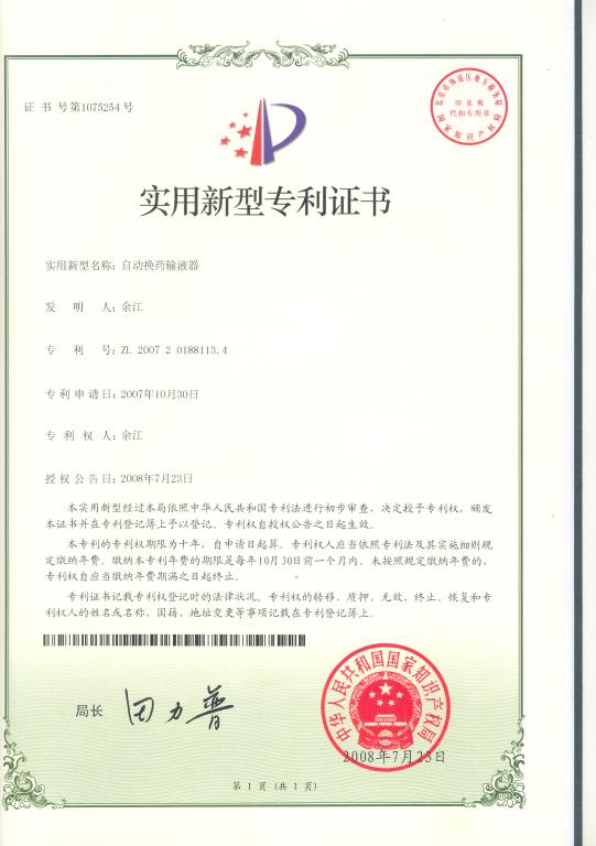 2008年7月,机械与包装工程学院05级机电一班学生余江同学自主研发的“自动换药输液器”经国家知识产权局核准,获国家实用新型专利,实现了我院在校生获取专利零的突破。