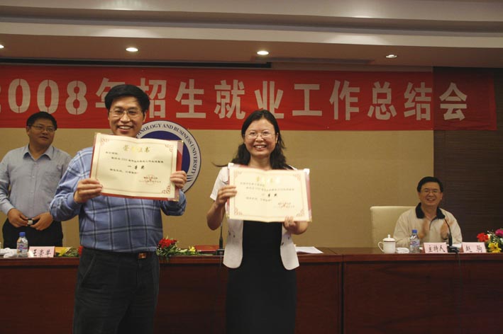 重庆工商大学2008年招生就业工作总结大会,于10月17-18日在风景秀丽的长寿湖山庄召开。因机械与包装工程学院各专业就业率高,与本校会计学院同时获得全校就业工作先进集体一等奖。学院党总支书记喻永红代表学院,在大会上作了经验交流,接受了学校领导的颁奖。