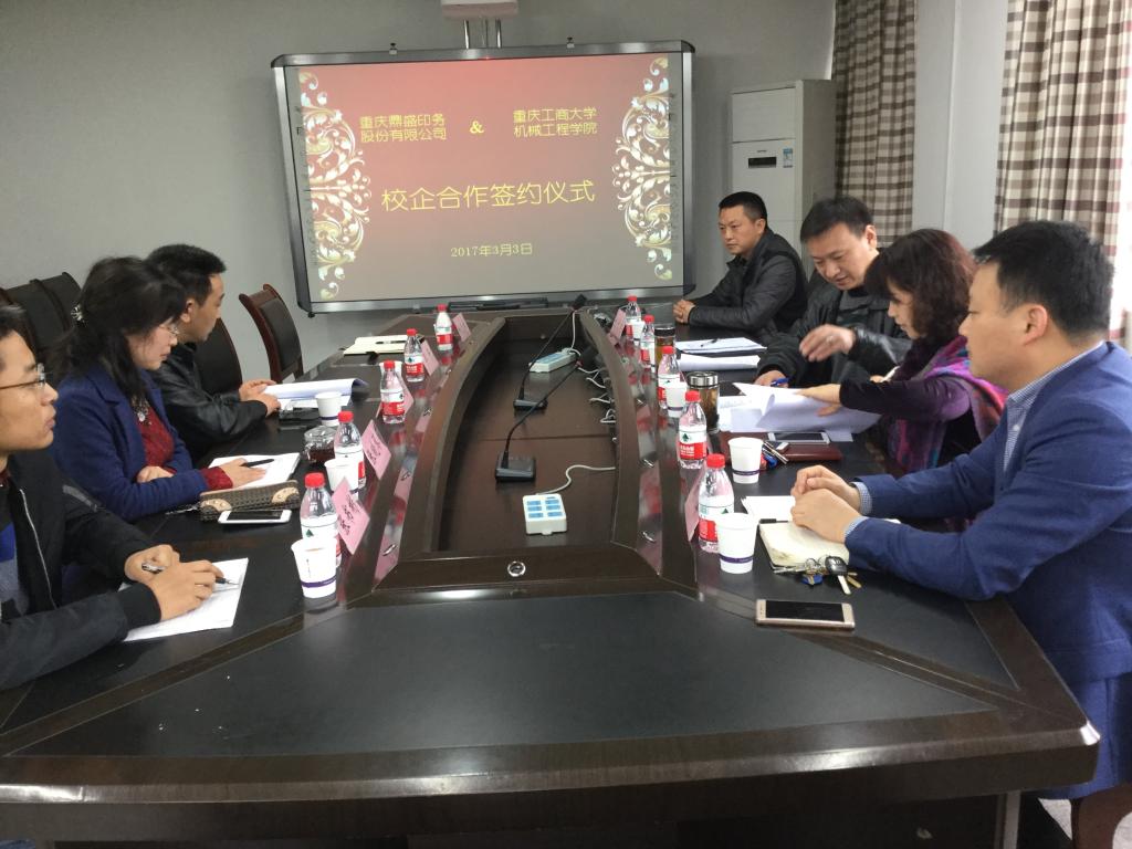 2017年4月10日,重庆鼎盛印务股份有限公司总经理邓贤鹏、综合部经理朱亚玲到122cc太阳集成游戏洽谈产学研合作事宜并与学院签署了产学研合作协议书。学院院长杜力、党总支书记刘洋等参与了合作交流洽谈。