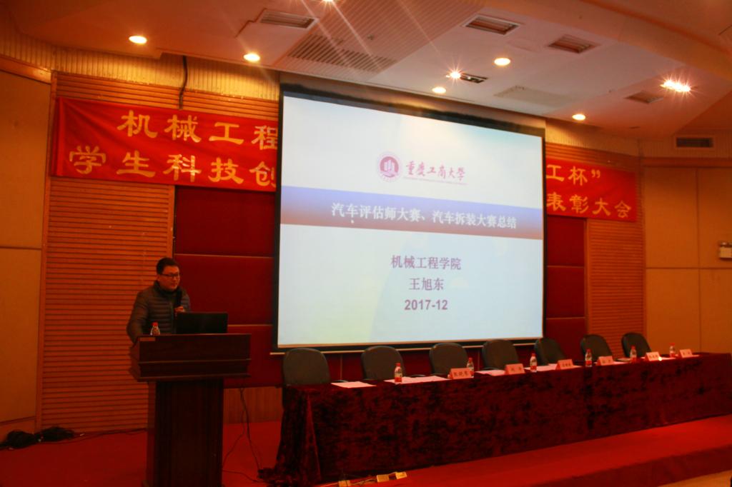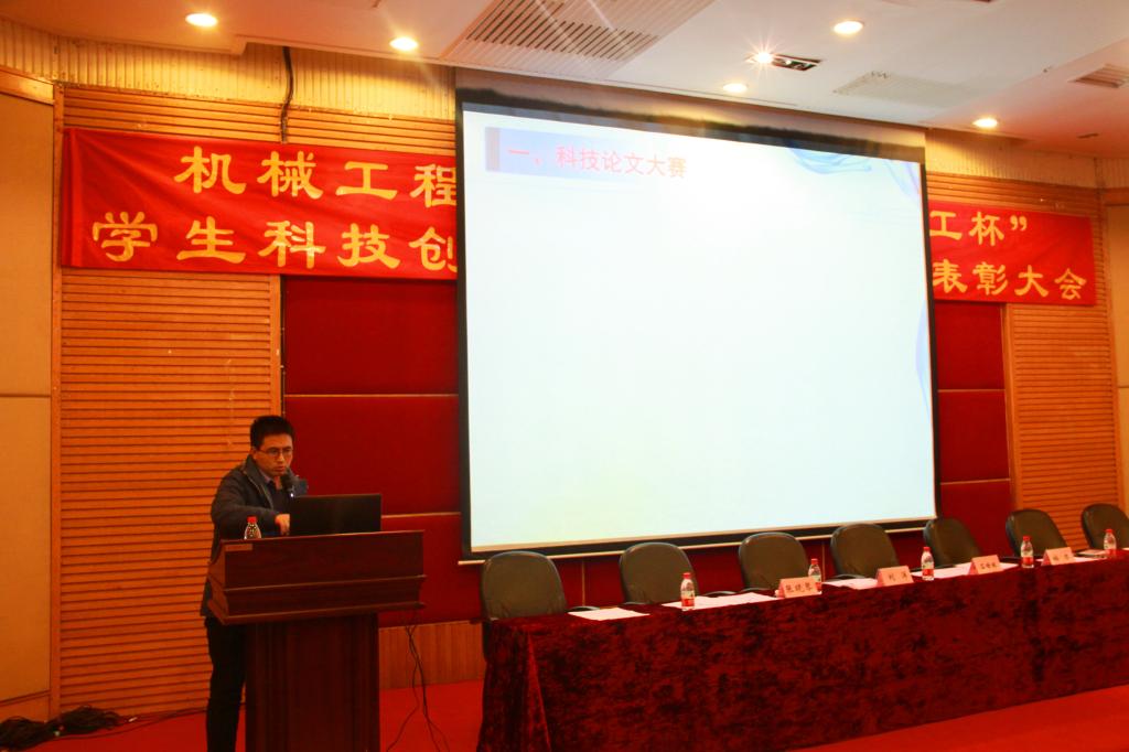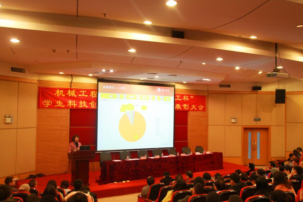 学生科技创新文化活动月活动作为我院的品牌活动之一,一直以来都作为学院引导学生熟悉、热爱本专业的桥梁和纽带。本届学生科技创新文化活动月依然历时一个多月,包括科技作品小发明小创作比赛、包装结构设计大赛、包装创意设计大赛、机器人大赛、工程制图大赛、科技论文大赛、汽车发动机拆装大赛、汽车评估师大赛、3D打印大赛,共有 267个团队,1067人次参加,参与率达71%。首先,学院院长杜力教授发言,她对整个活动情况进行了点评,并以年级为单位对每一个班级的参赛率进行了分析和总结,鼓励同学们更加不畏困难、勇于创新和探索,希望更多的同学参与各类科技活动,通过科技活动和竞赛来提高专业素质和综合能力。之后,4位系主任作为指导老师代表分别对比赛情况、评分规则及优秀作品进行了详细的介绍,对参赛同学们取得的成绩给予了充分的肯定和鼓励,指出了存在的问题与不足,给出了建设性的意见和建议,并进一步动员更多地同学参与到科技活动中来。随后,激动人心的颁奖仪式正式开始。获奖代表依次上台领奖后,参赛学生代表王昊进行发言,以参加学科竞赛给自己带来的益处出发鼓励同学们积极投身学科竞赛。